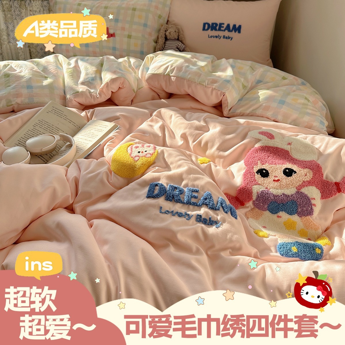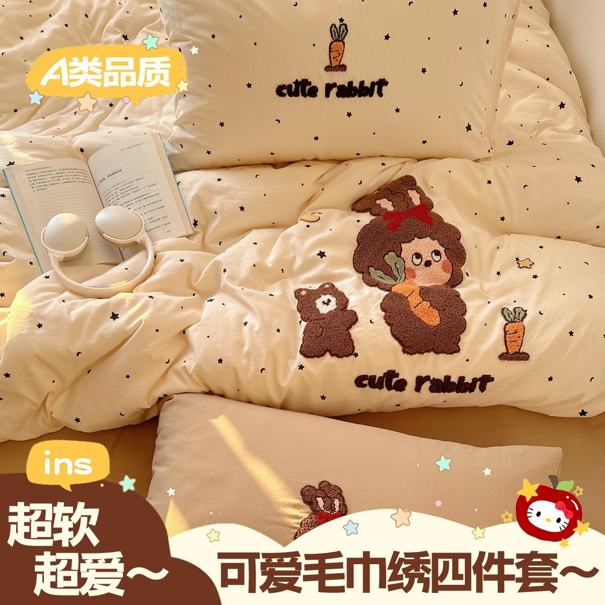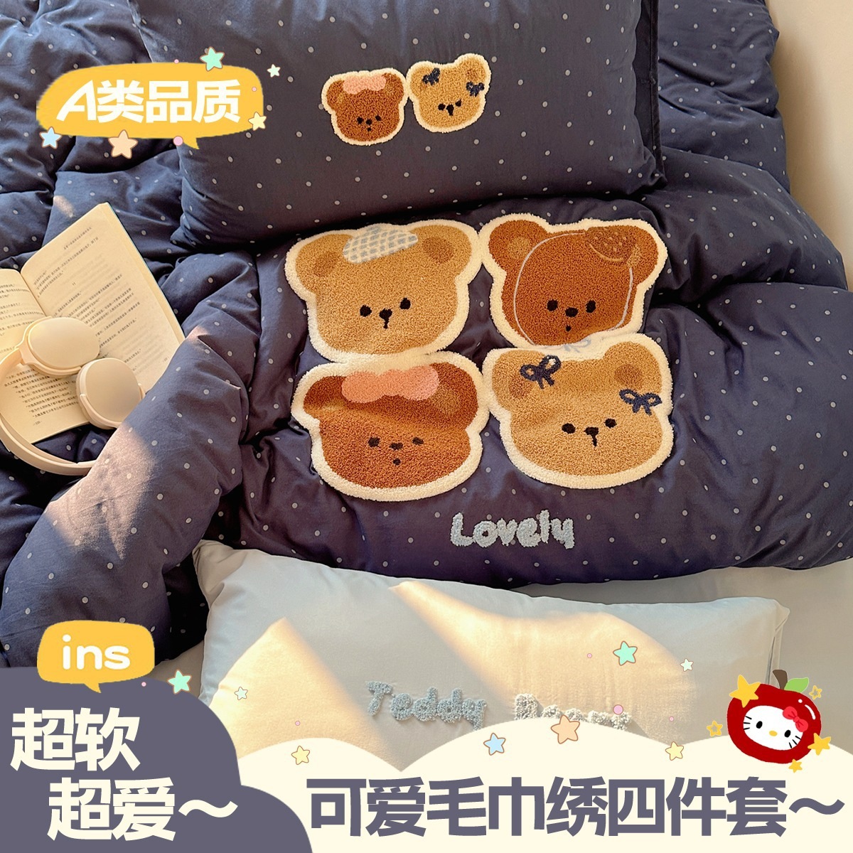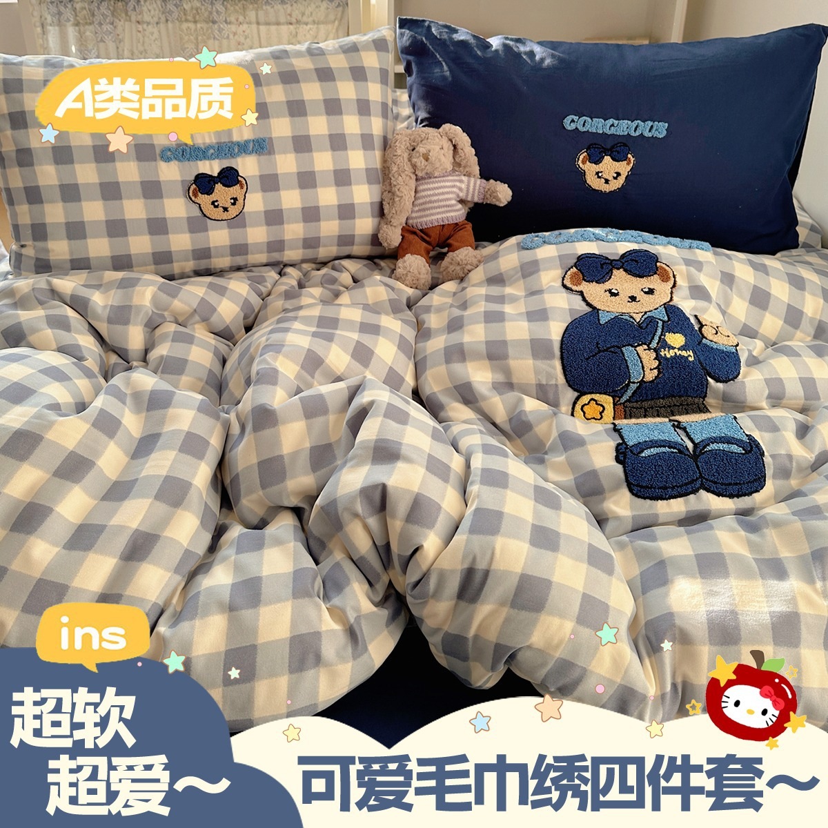 カートゥーン タオル刺繍 コットン100% ベッド4点セット 素肌に優しい かわいい 清新 純綿 シーツ カバー 寮 3点