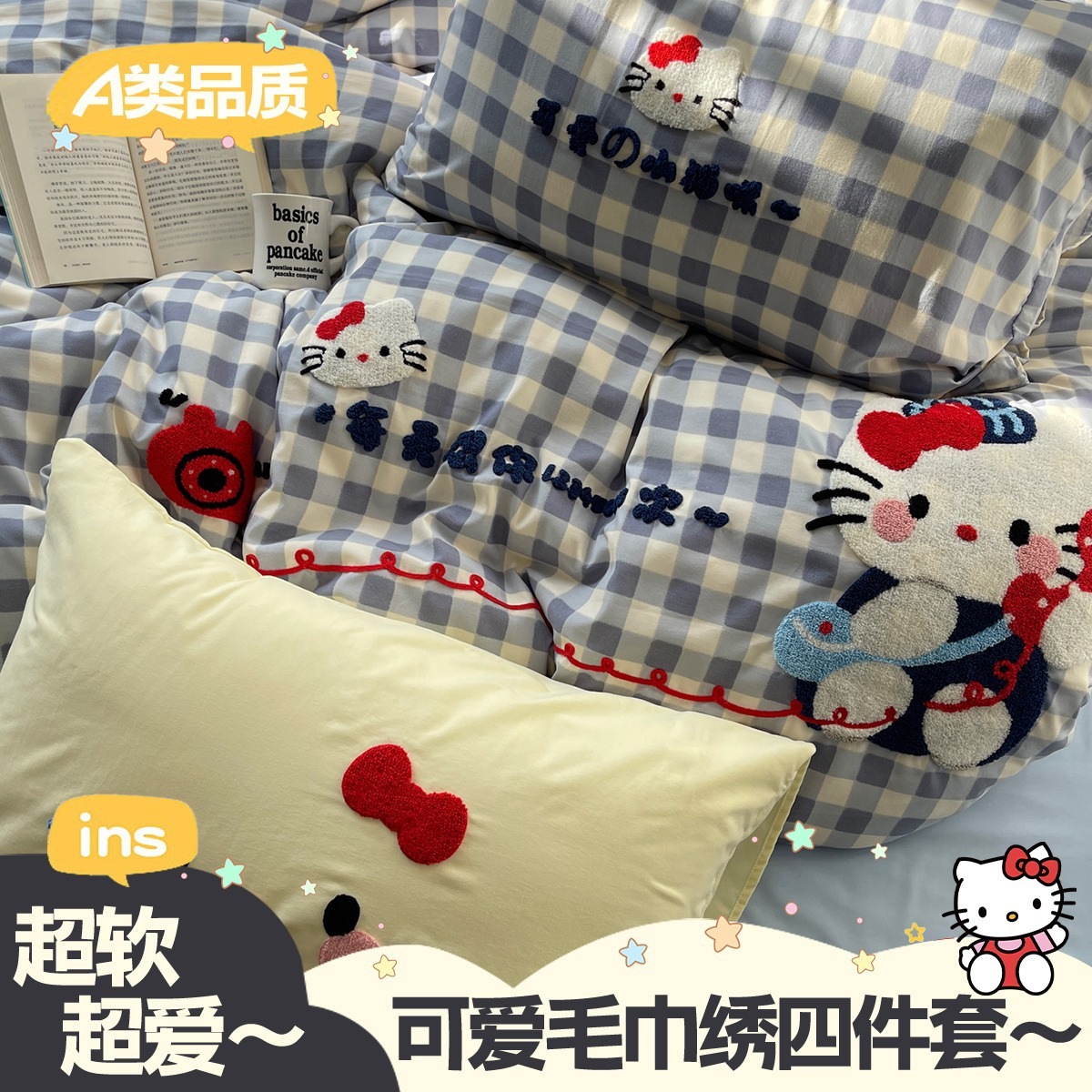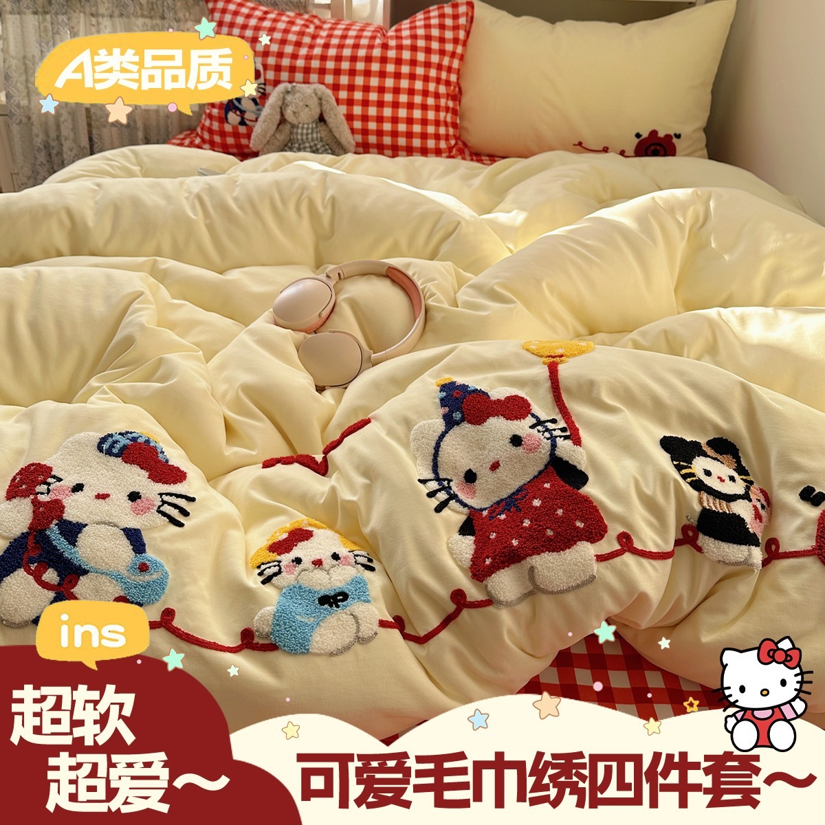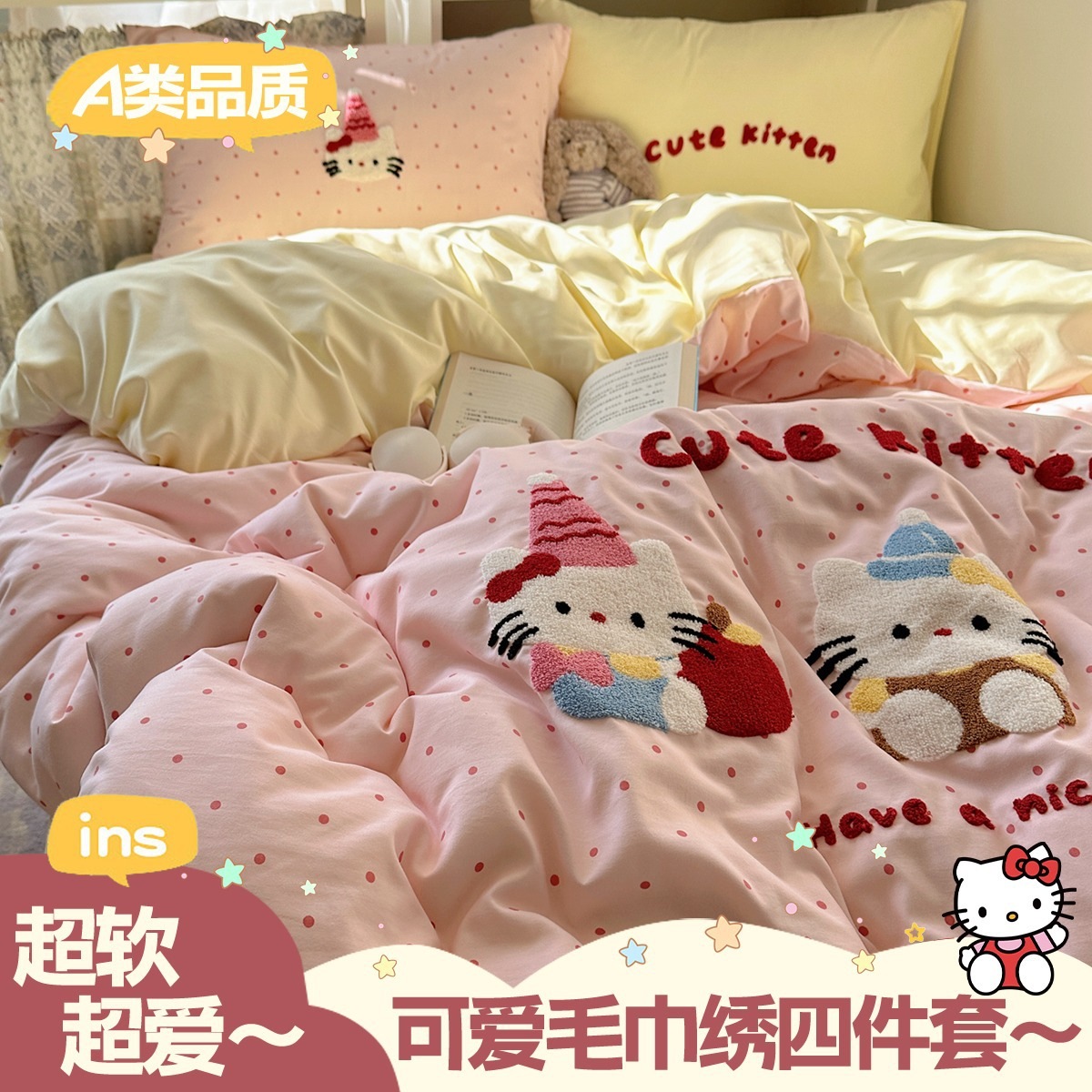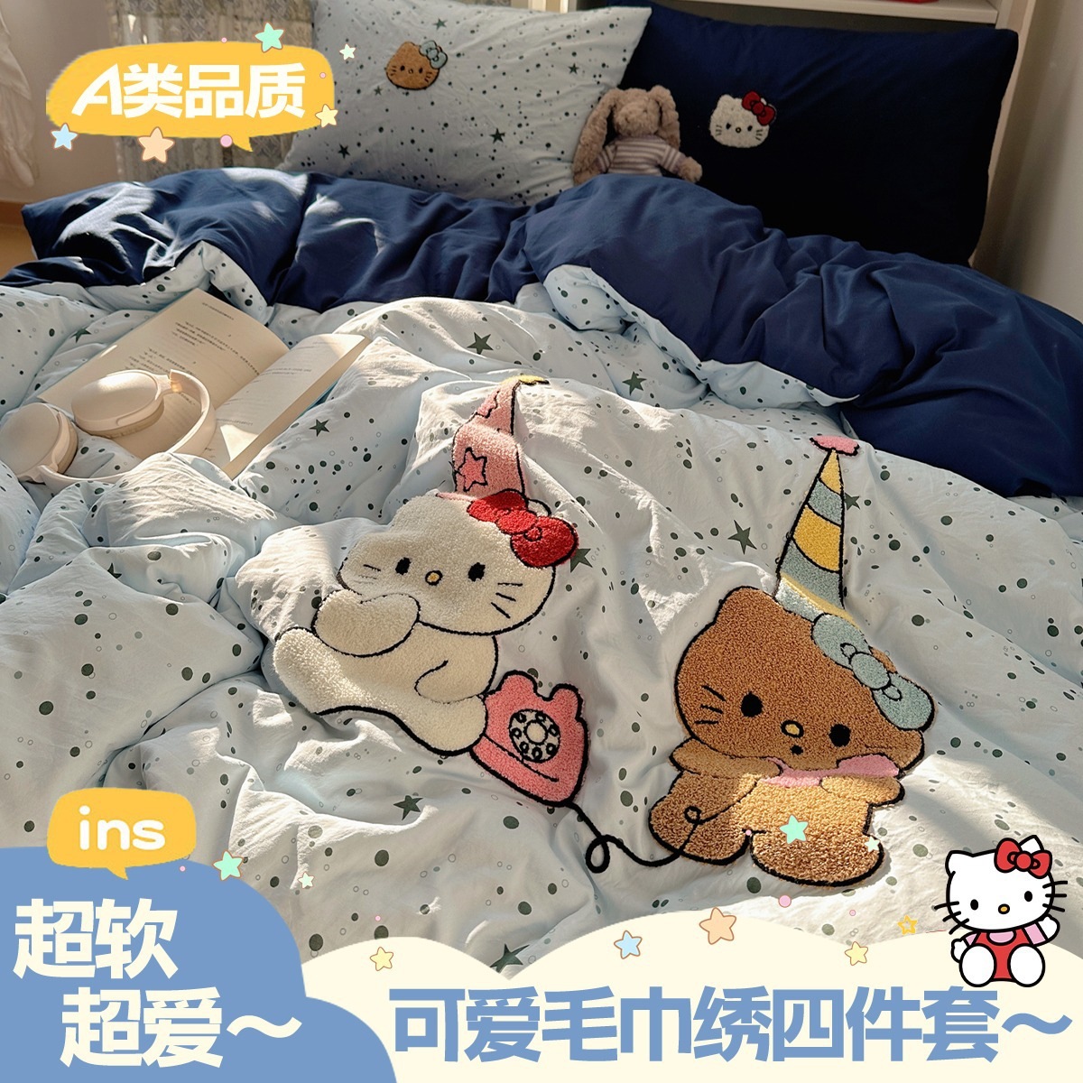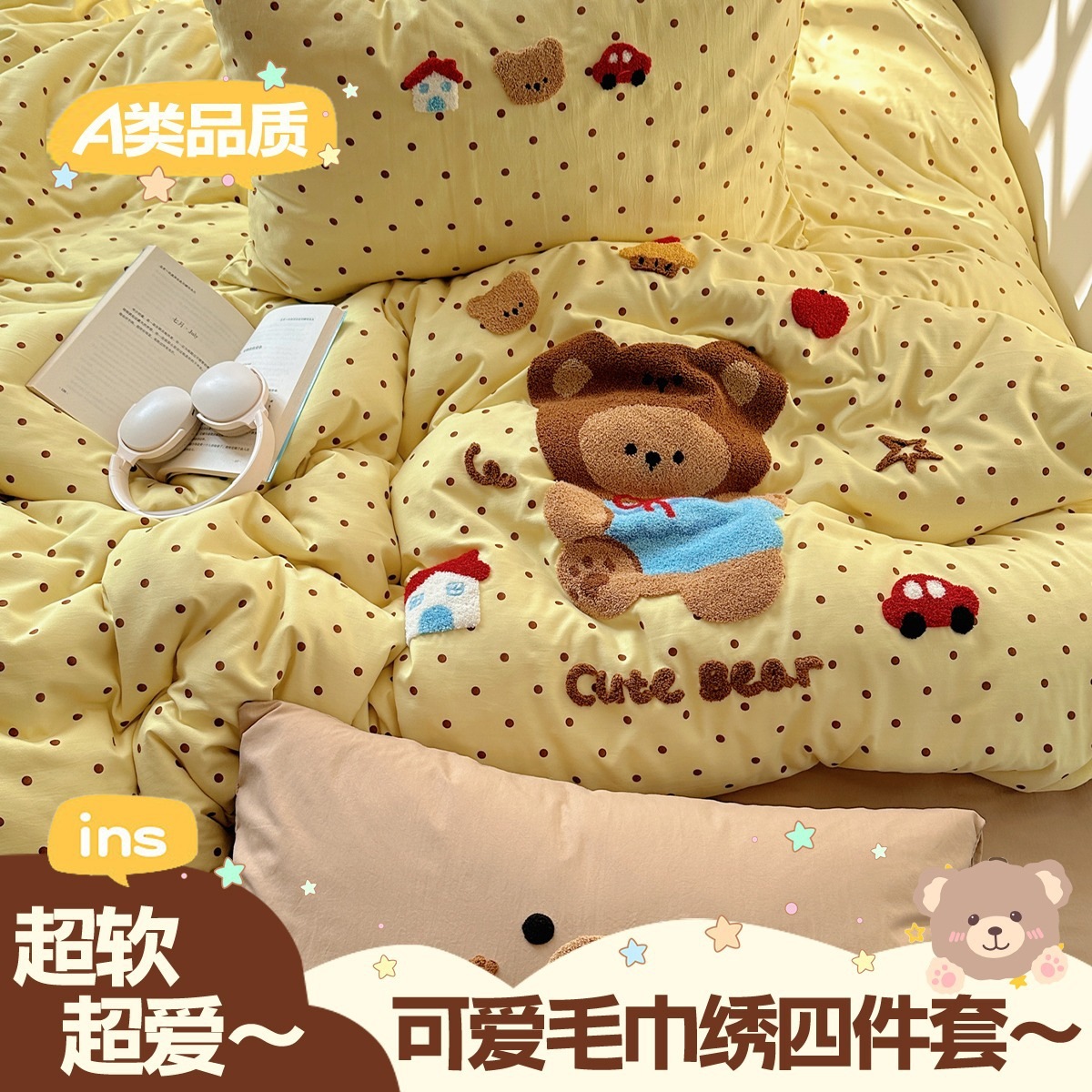 カートゥーン タオル刺繍 コットン100% ベッド4点セット 素肌に優しい かわいい 清新 純綿 シーツ カバー 寮 3点