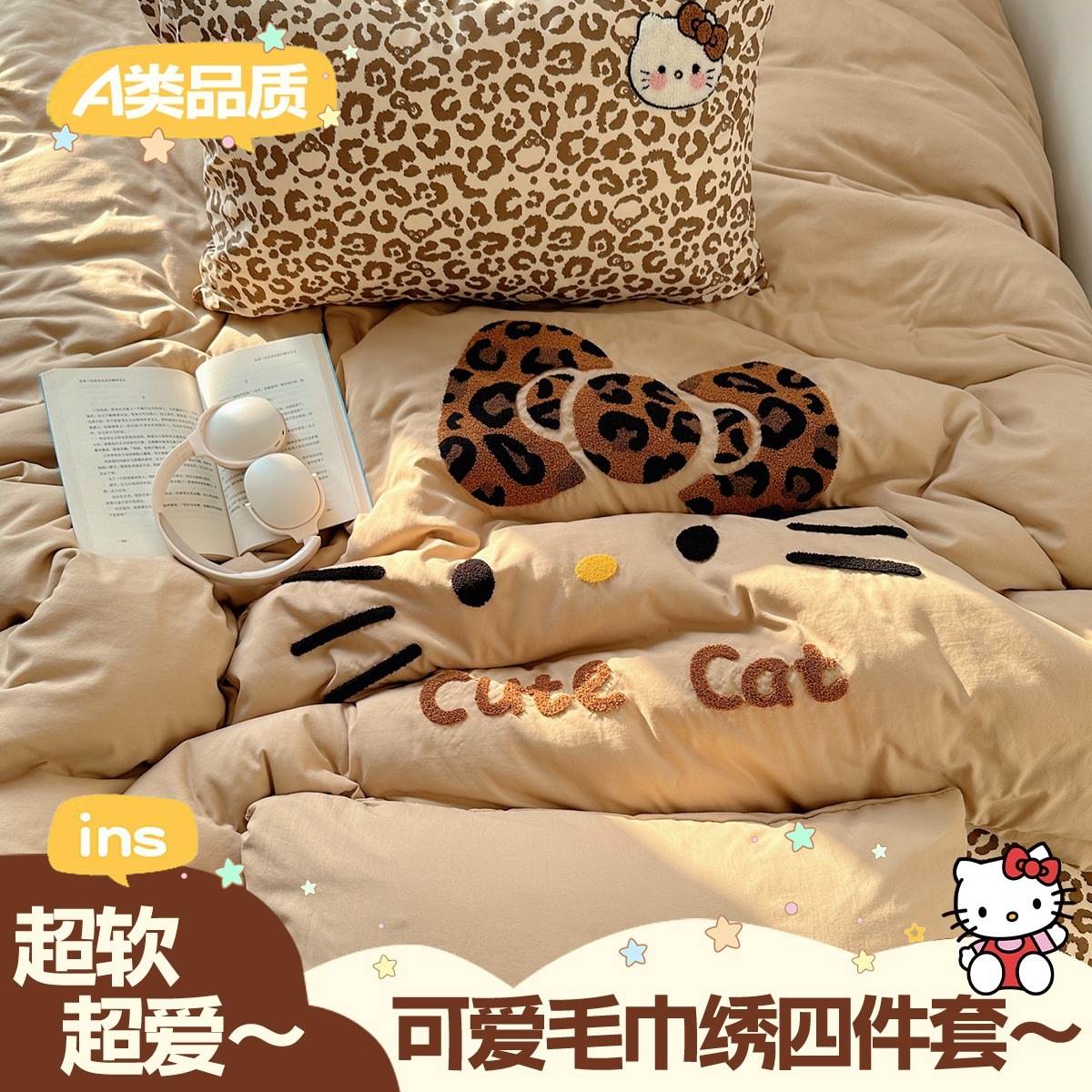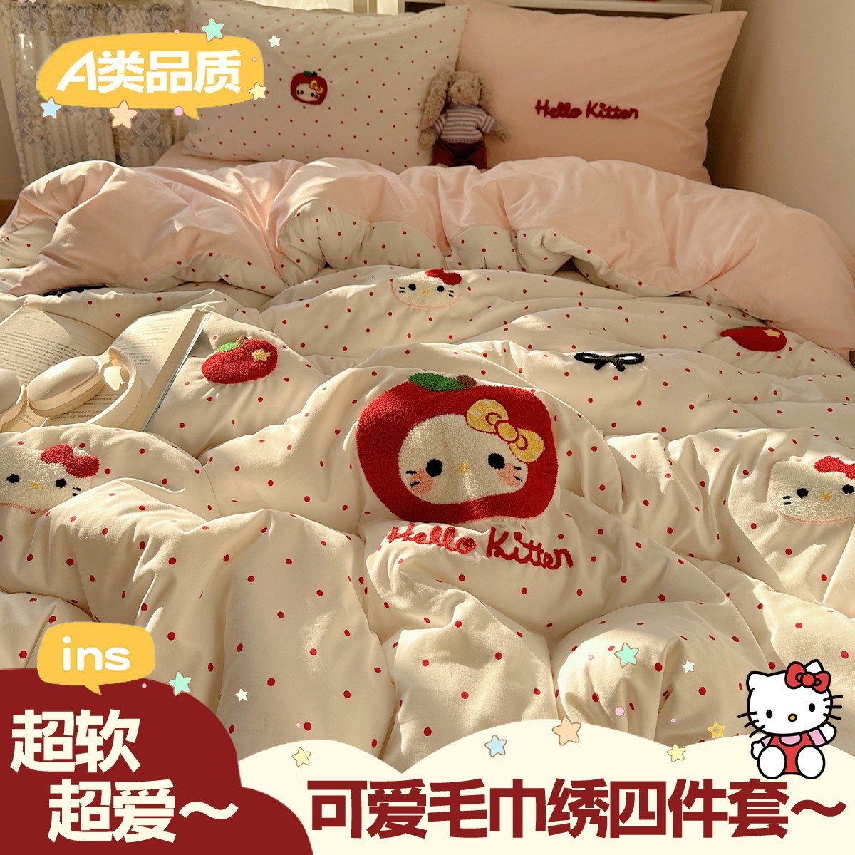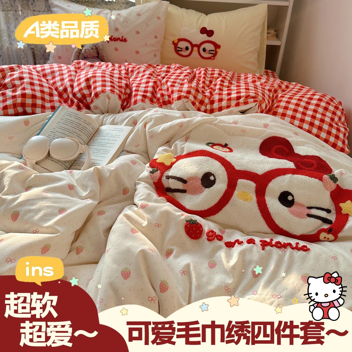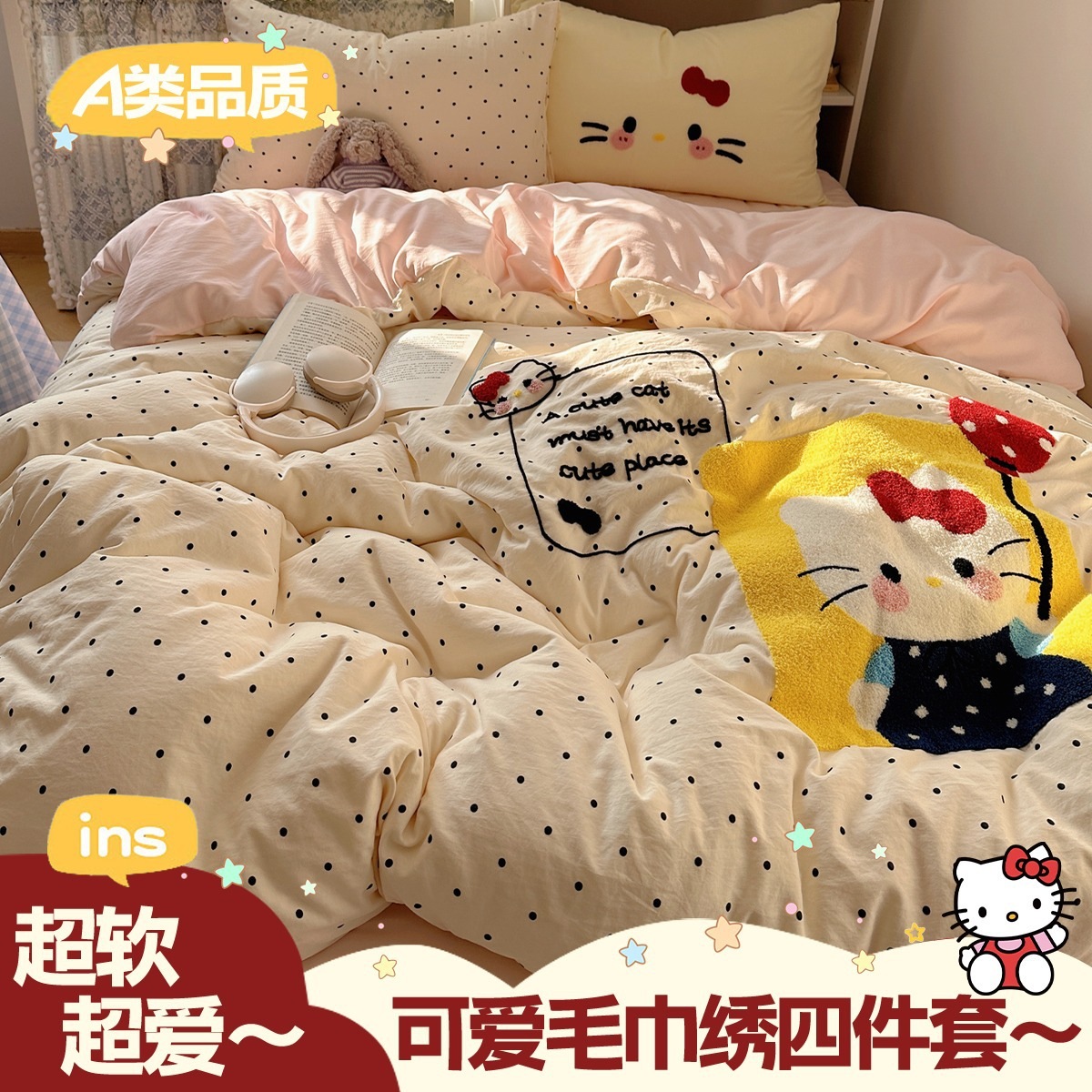 カートゥーン タオル刺繍 コットン100% ベッド4点セット 素肌に優しい かわいい 清新 純綿 シーツ カバー 寮 3点