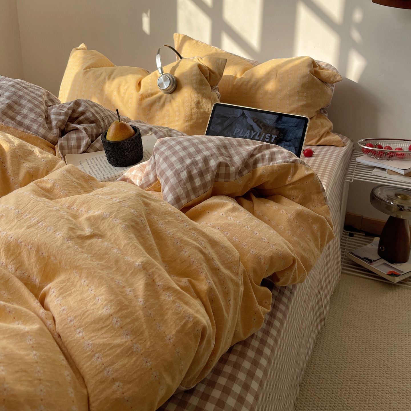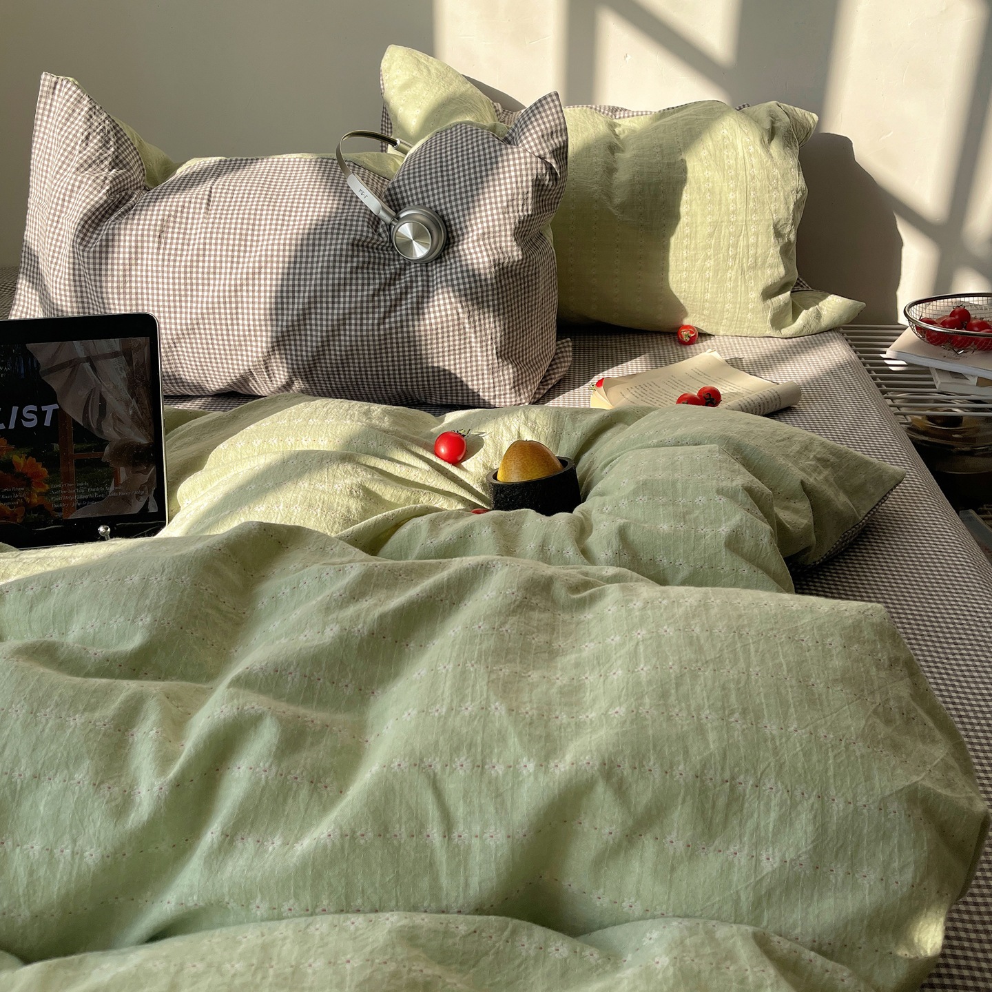 A類 ベビー向け 素肌に優しい コットン100% ベッド4点セット シンプル格子 純綿 柔らか シーツ カバー 寮 3点