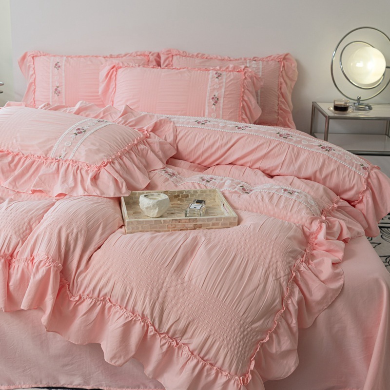 プリンセス風 純綿 4点セット レース シャボネット 刺繍 水洗い綿 ボックスシーツ カバー 3点セット