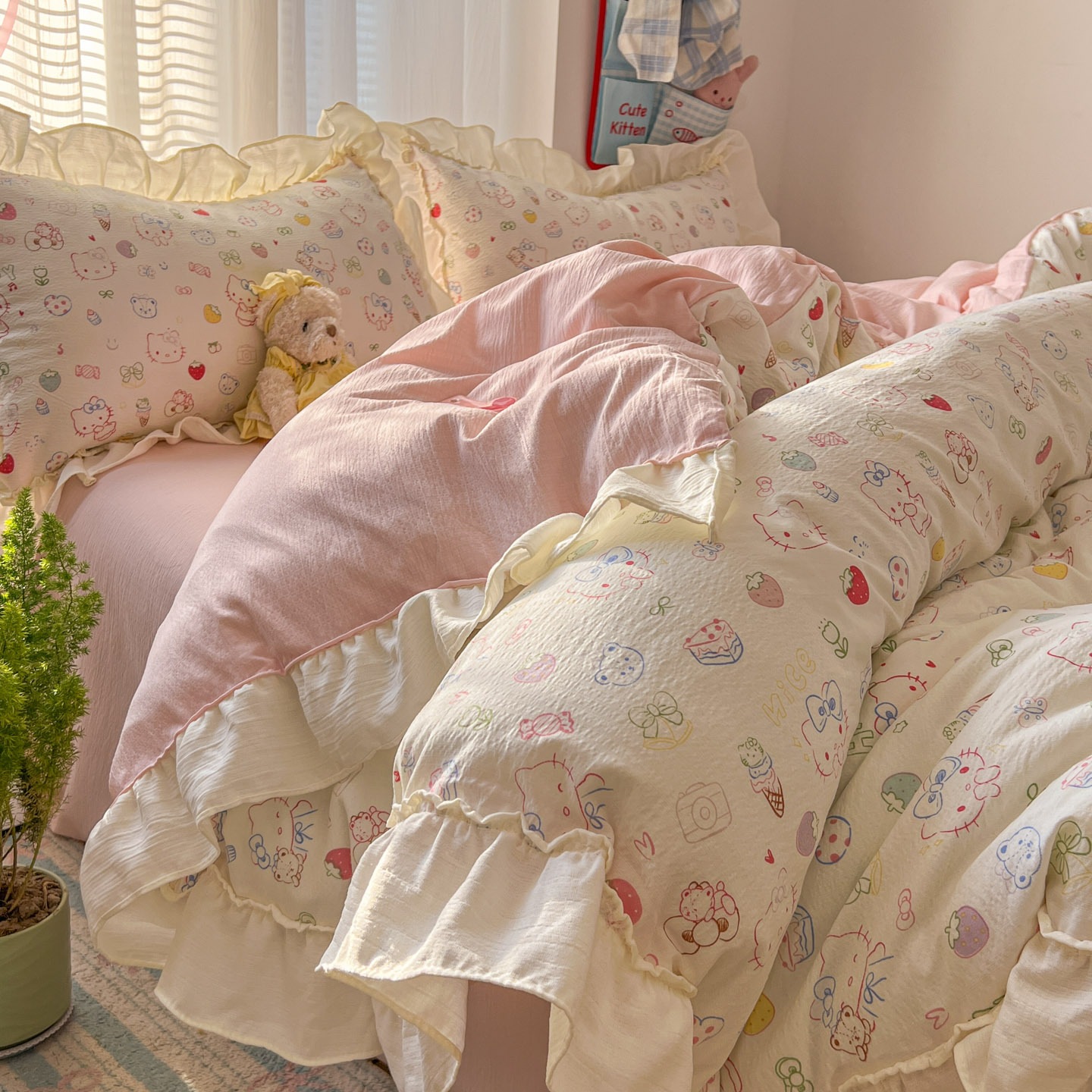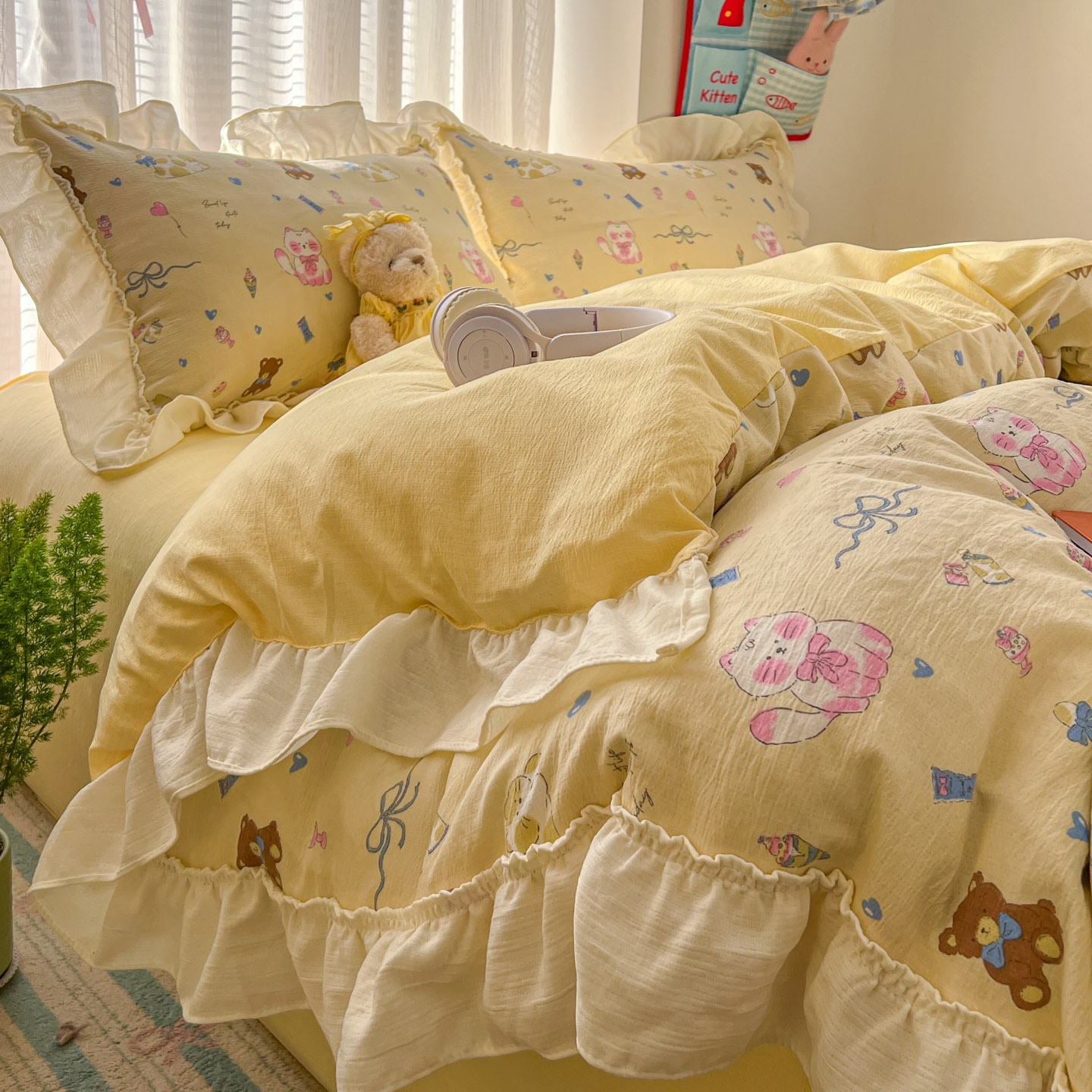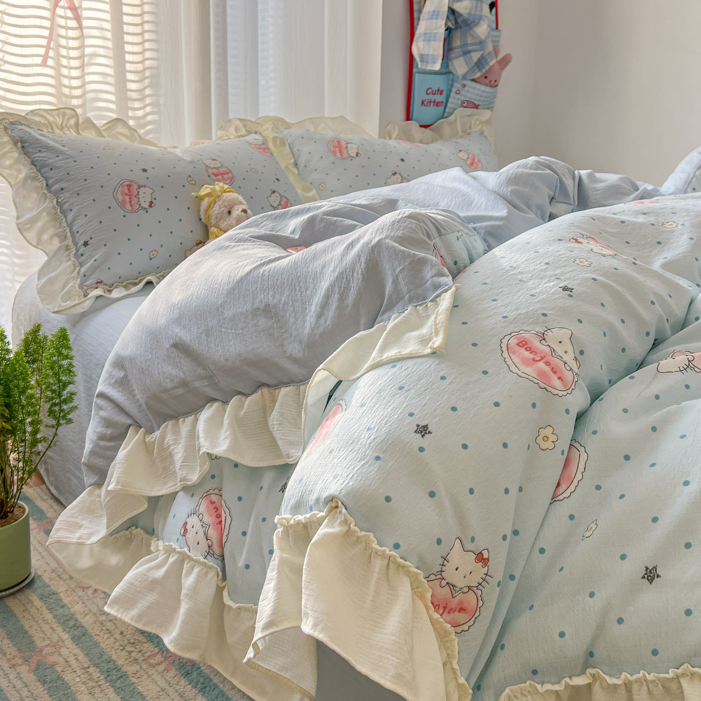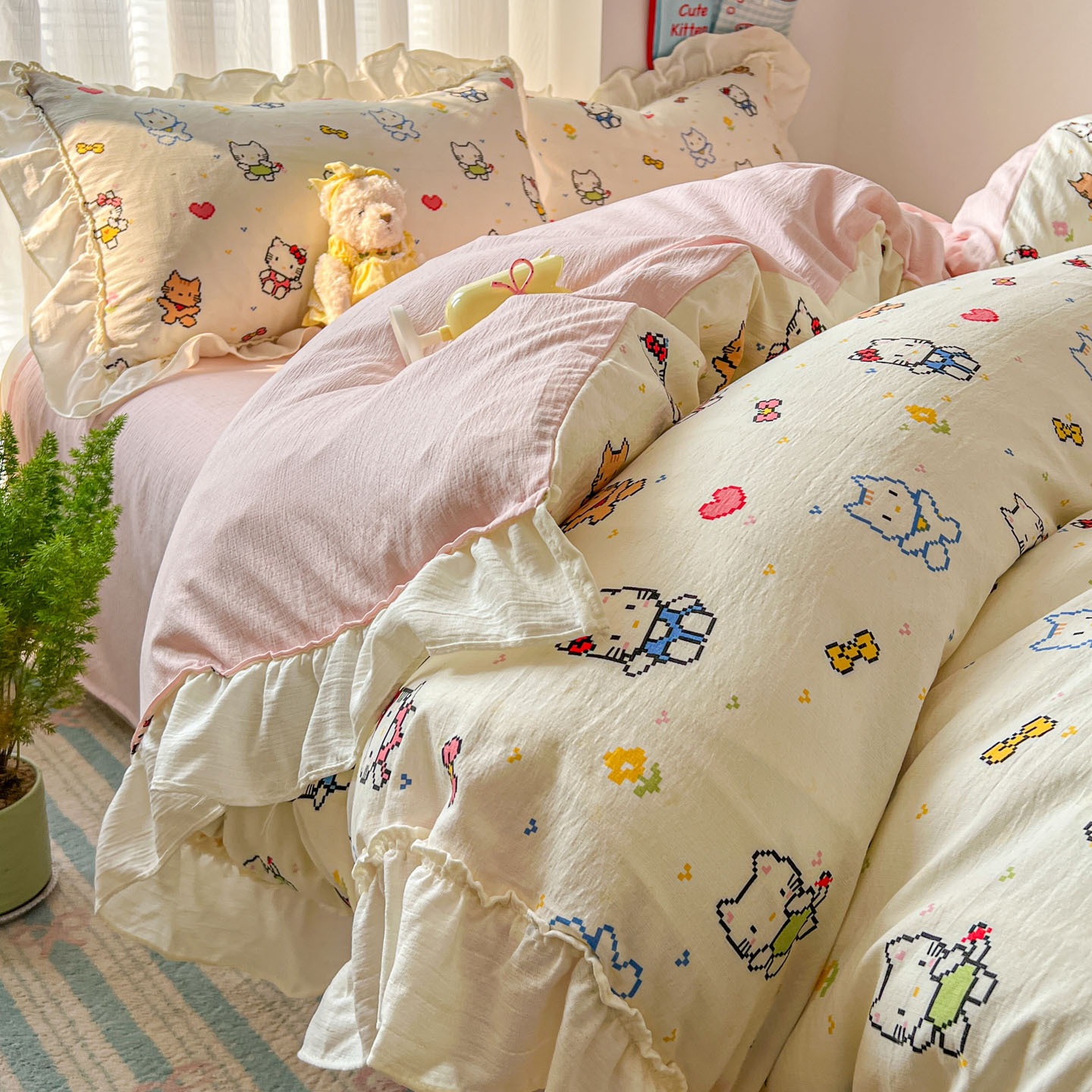 コットン100% 小清新 レース 少女 かわいい ベッド4点セット プリンセス風 カバー シーツ 寮 3点