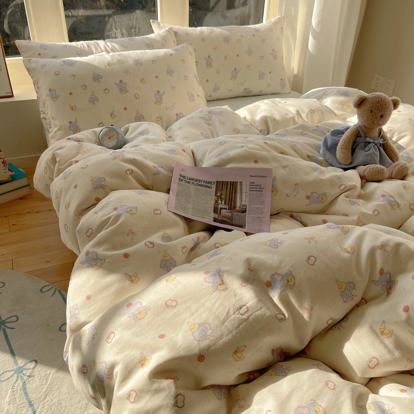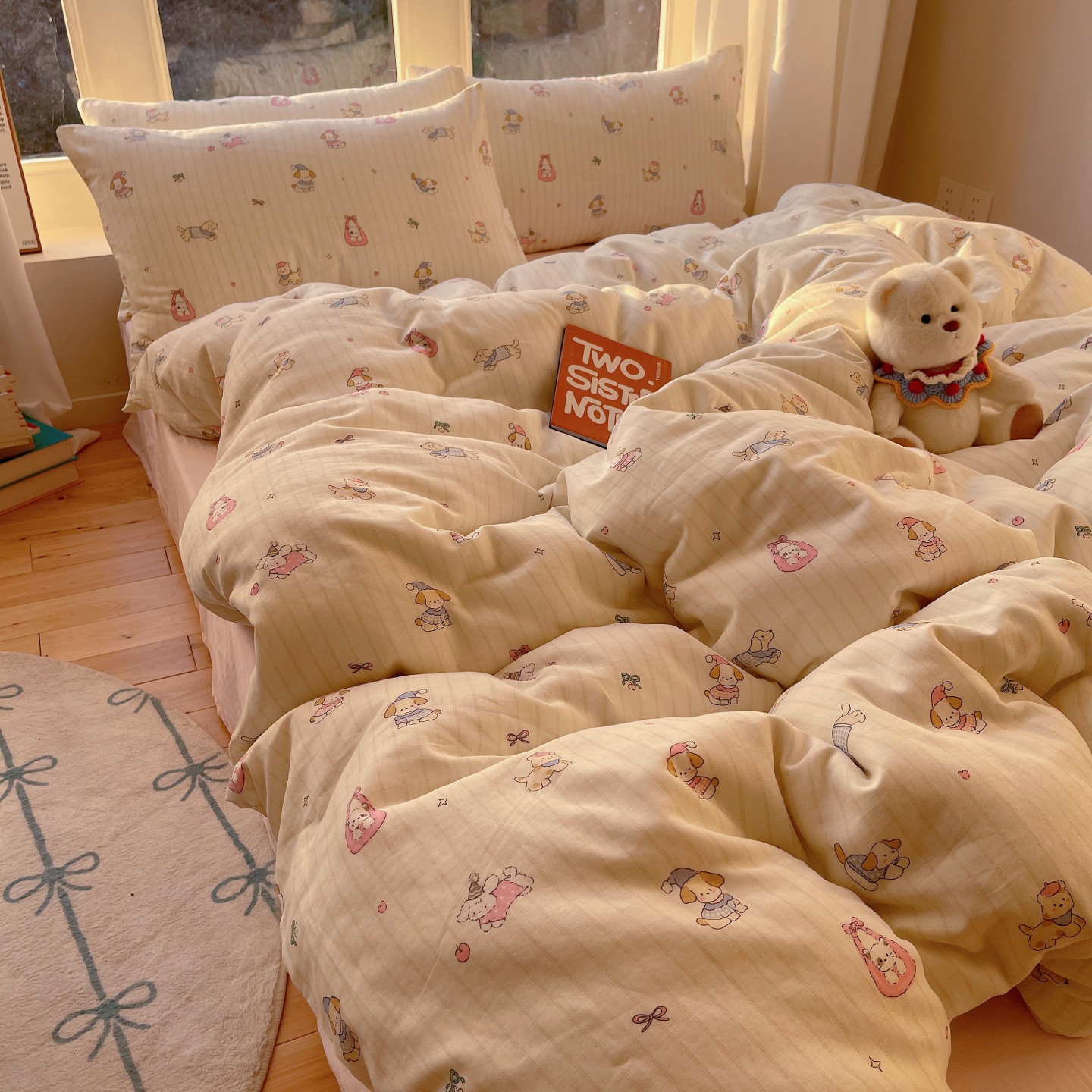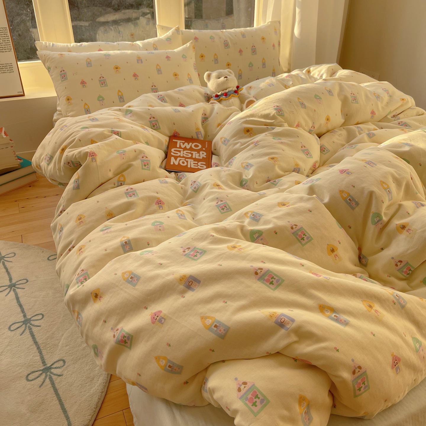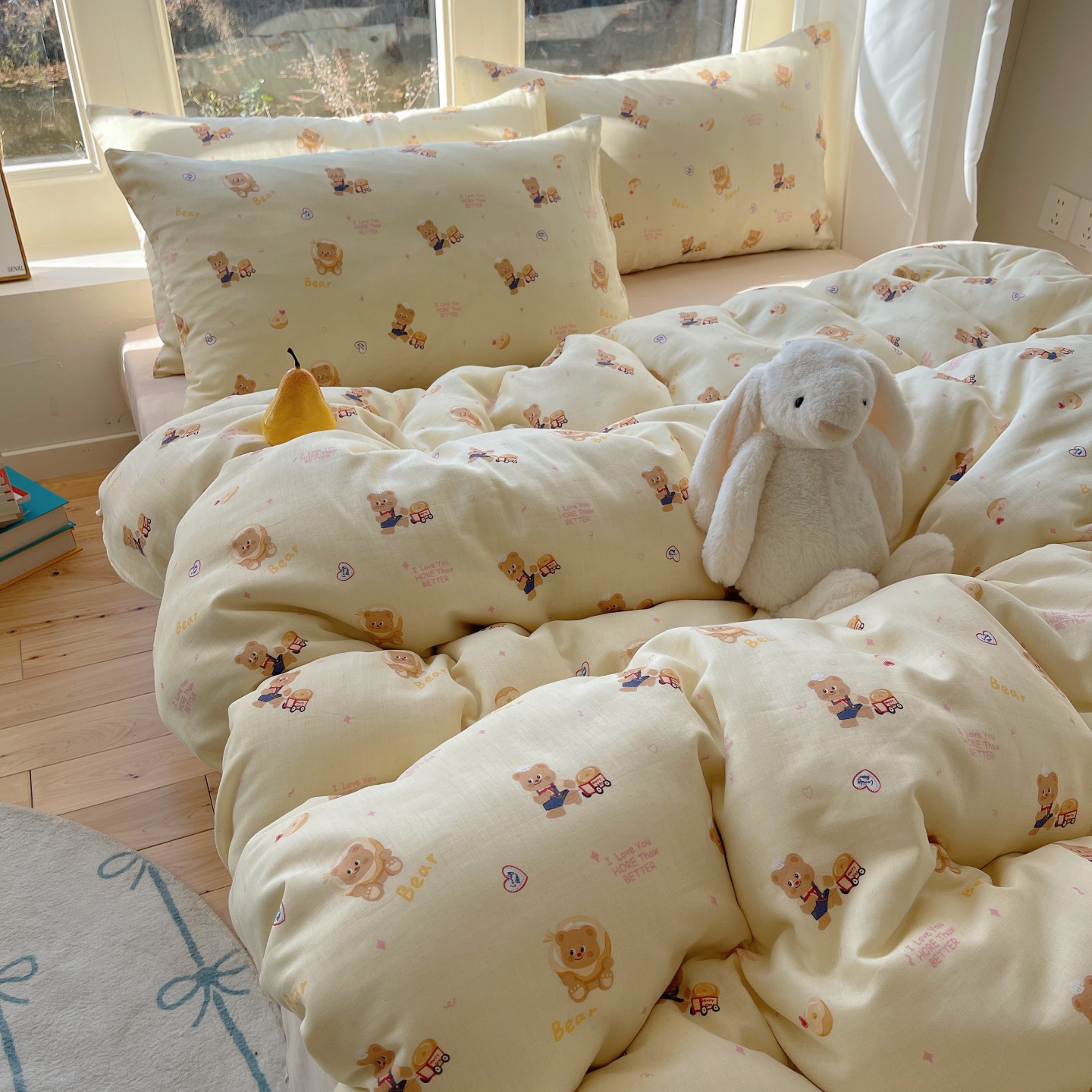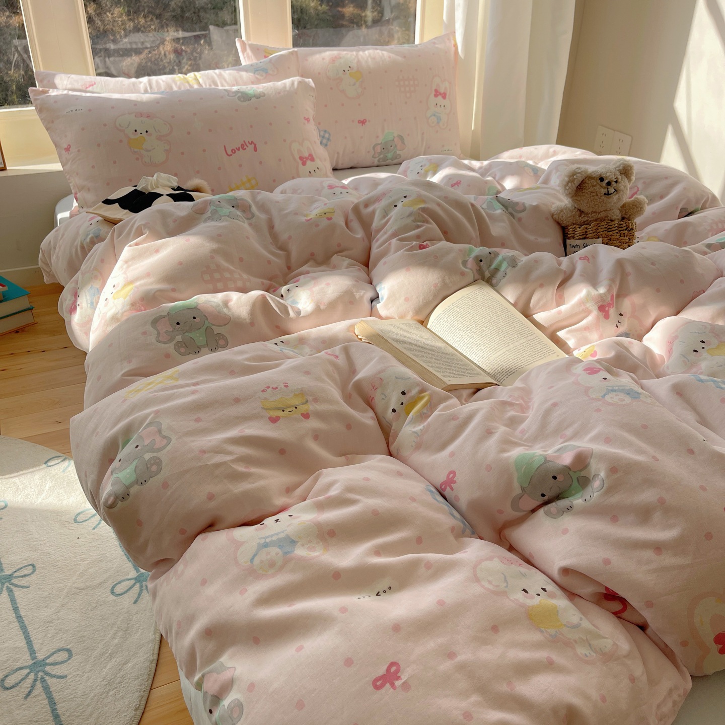 ダブルガーゼ コットン100% ベッド4点セット 小清新 カートゥーン 純綿 シーツ カバー 少女 寮 3点セット