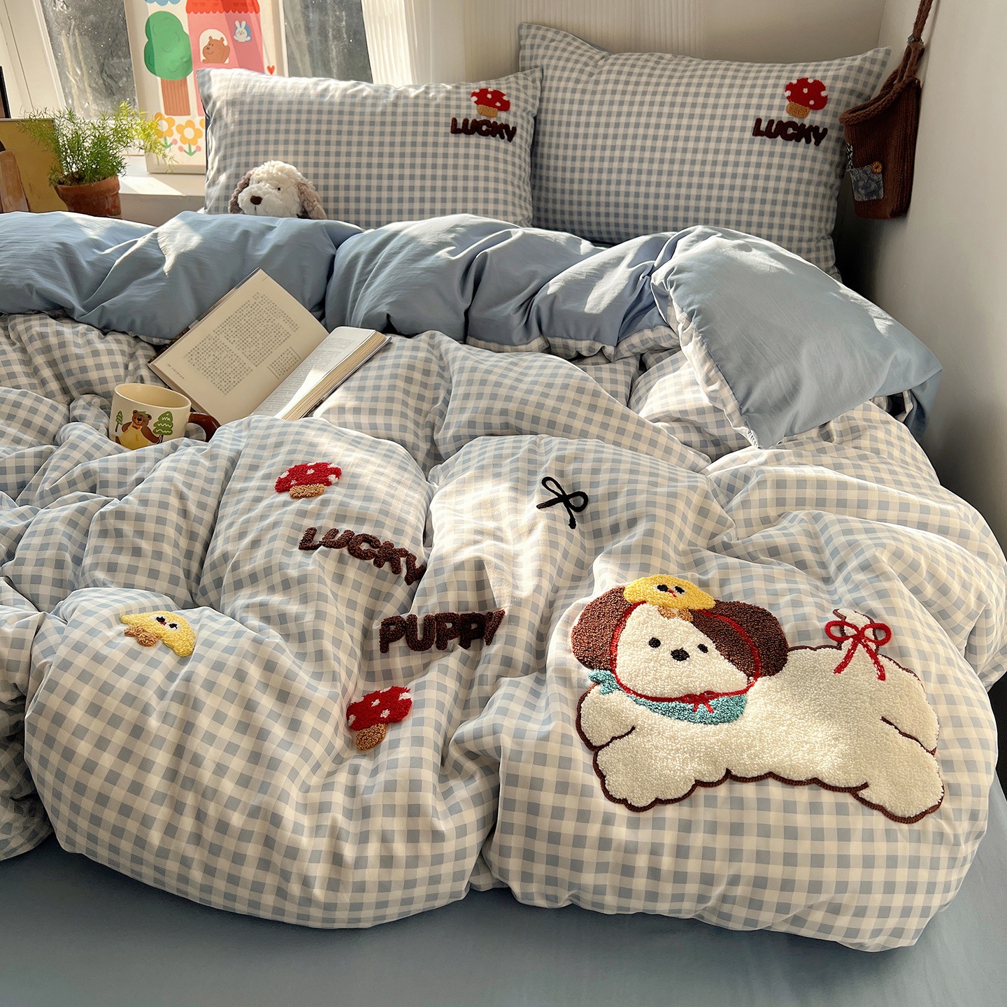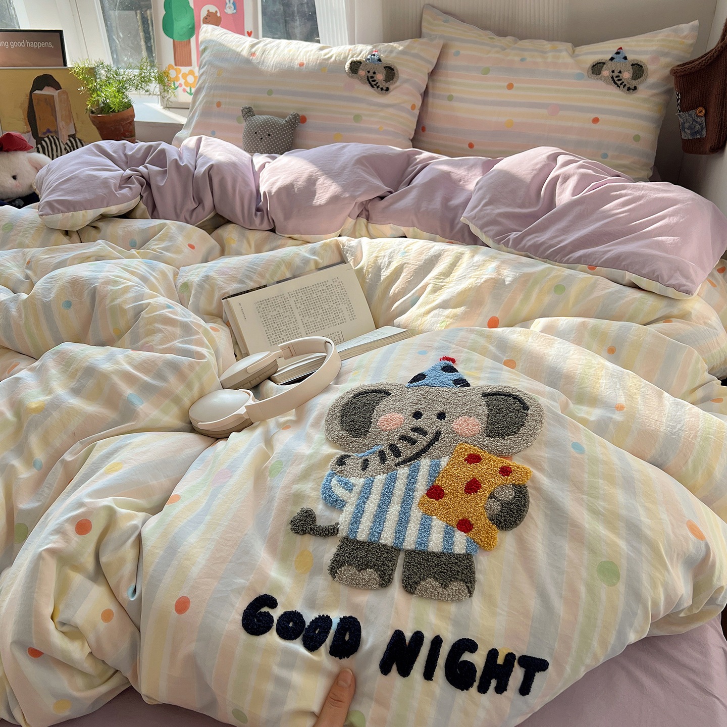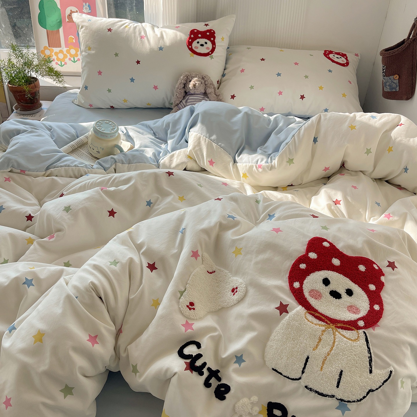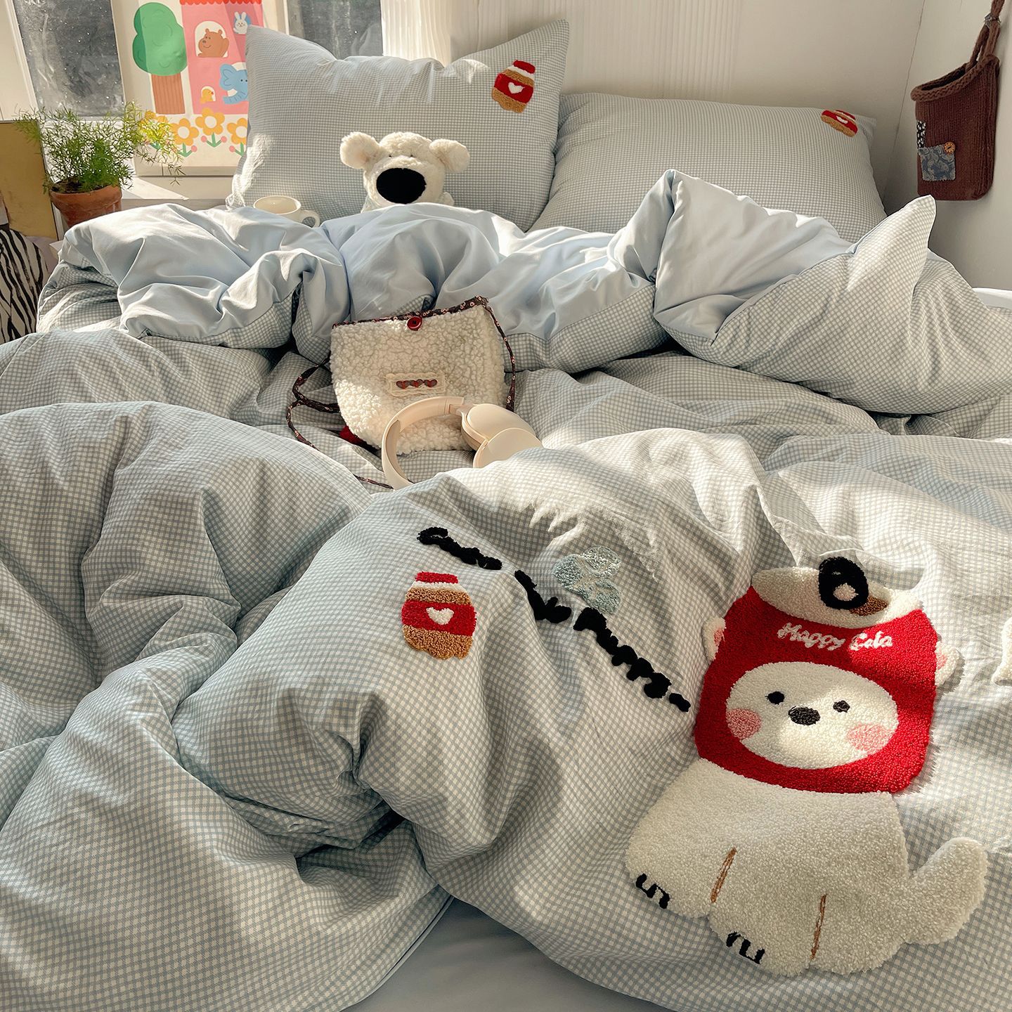 a類 コットン100% カートゥーン タオル刺繍 4点セット かわいい 純綿 シーツ カバー 寮 素肌に優しい 3点セット4