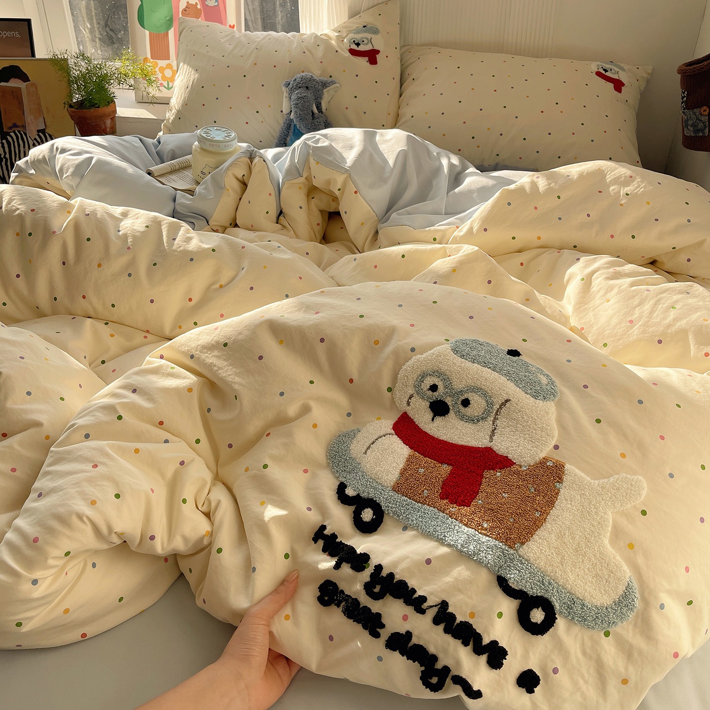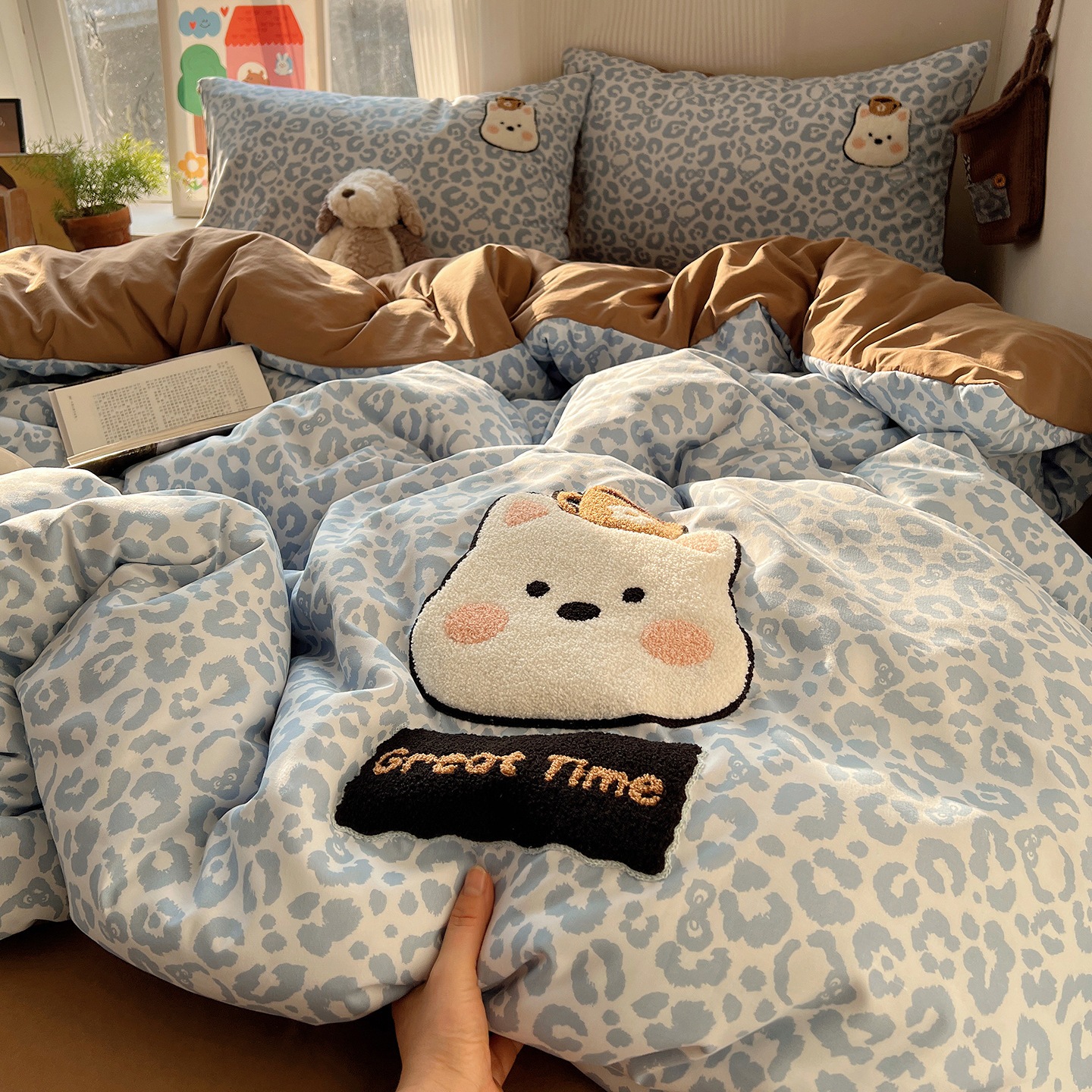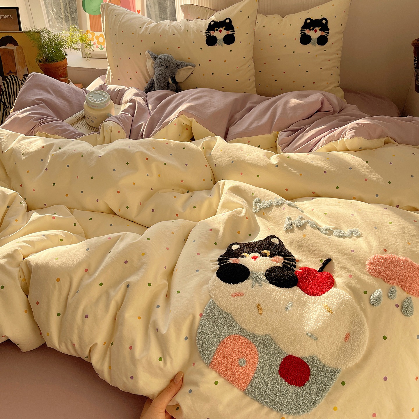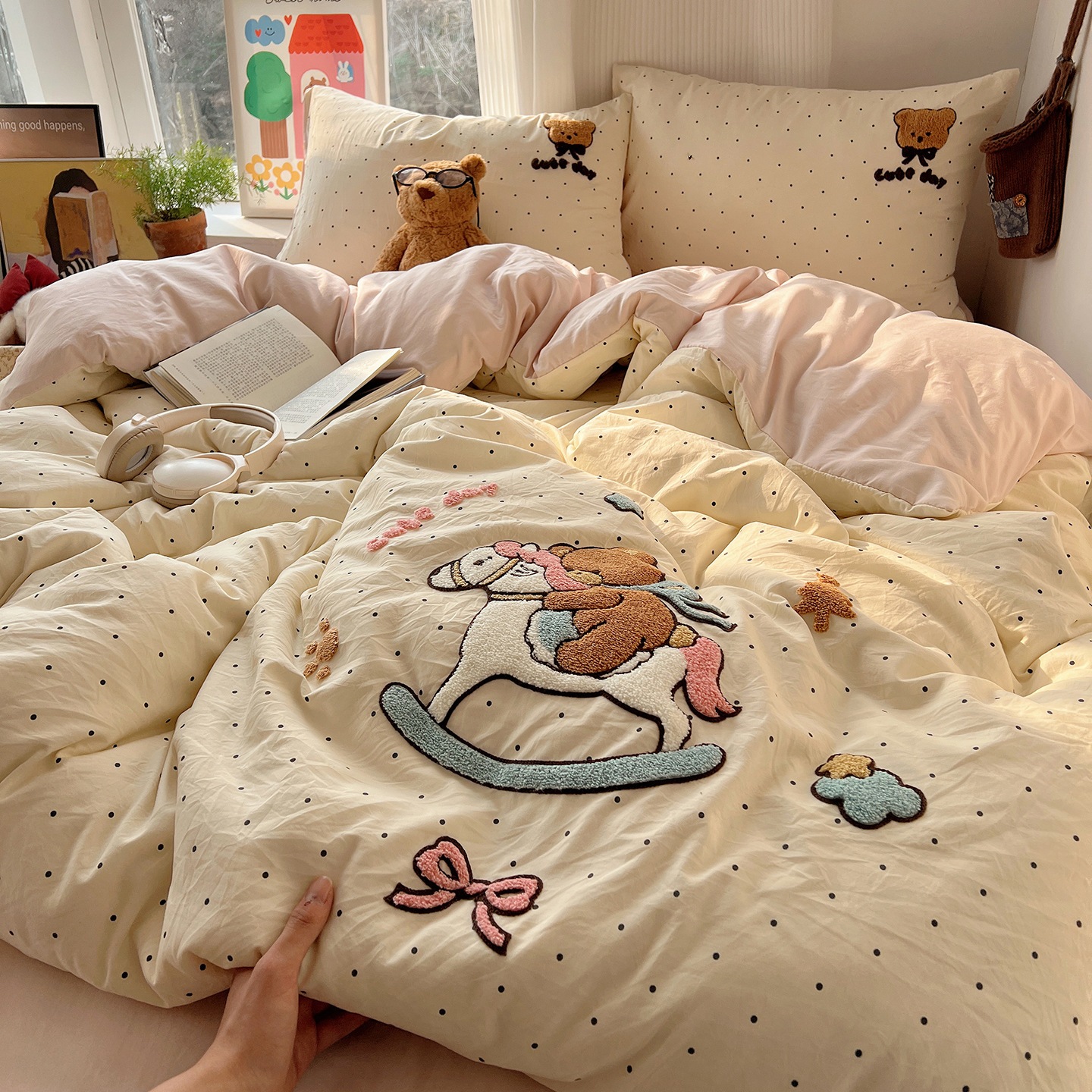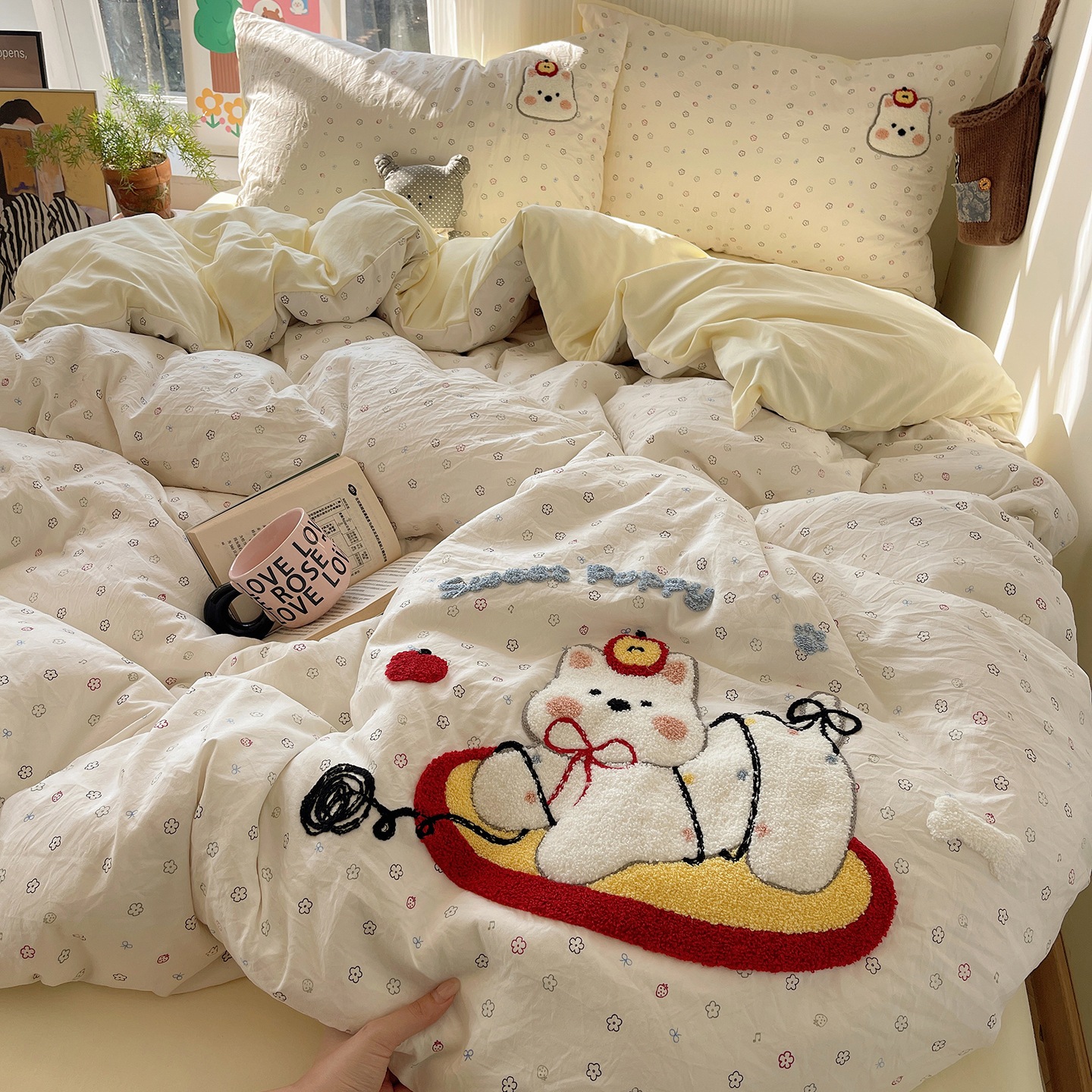 a類 コットン100% カートゥーン タオル刺繍 4点セット かわいい 純綿 シーツ カバー 寮 素肌に優しい 3点セット4