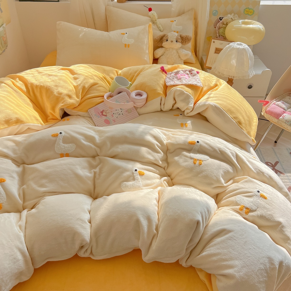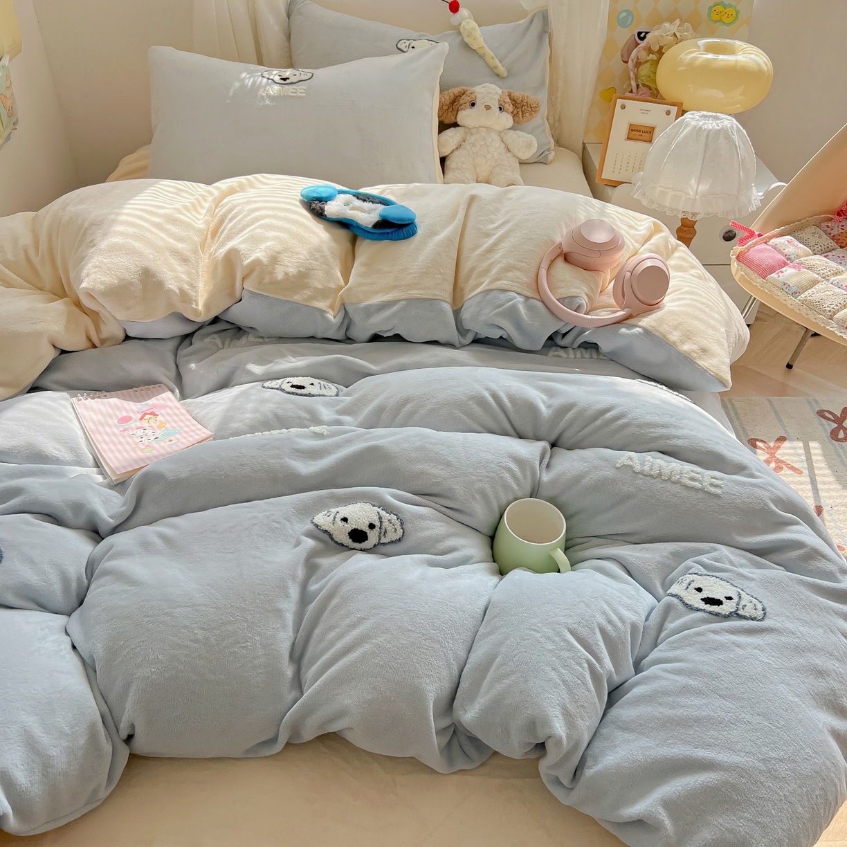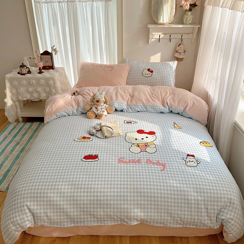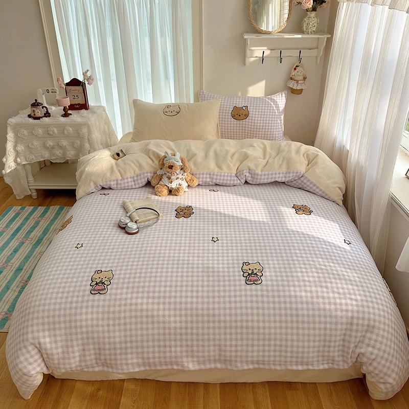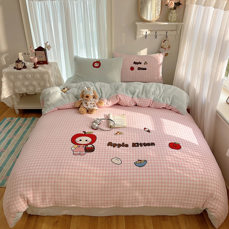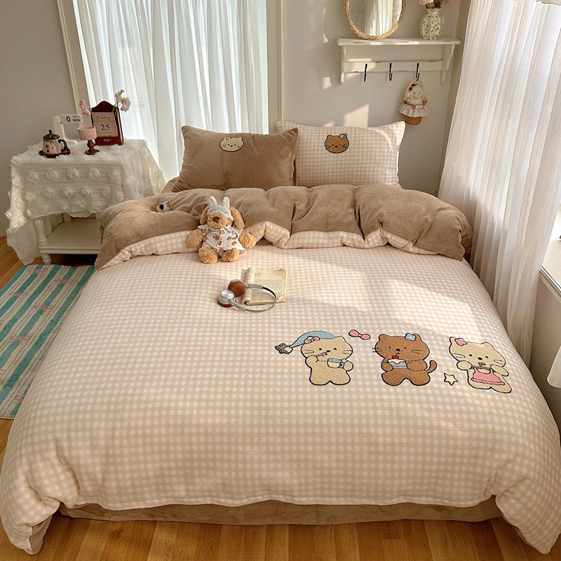 カートゥーン 厚手 ミルクボア 4点セット かわいい タオル刺繍 キッズ コーデュロイボア カバー 学生寮 3点セット