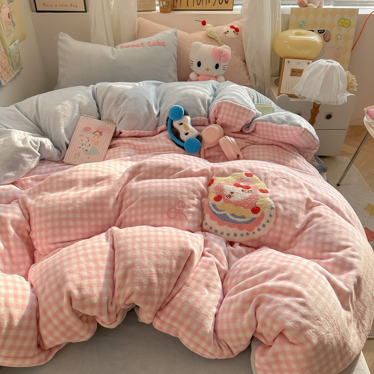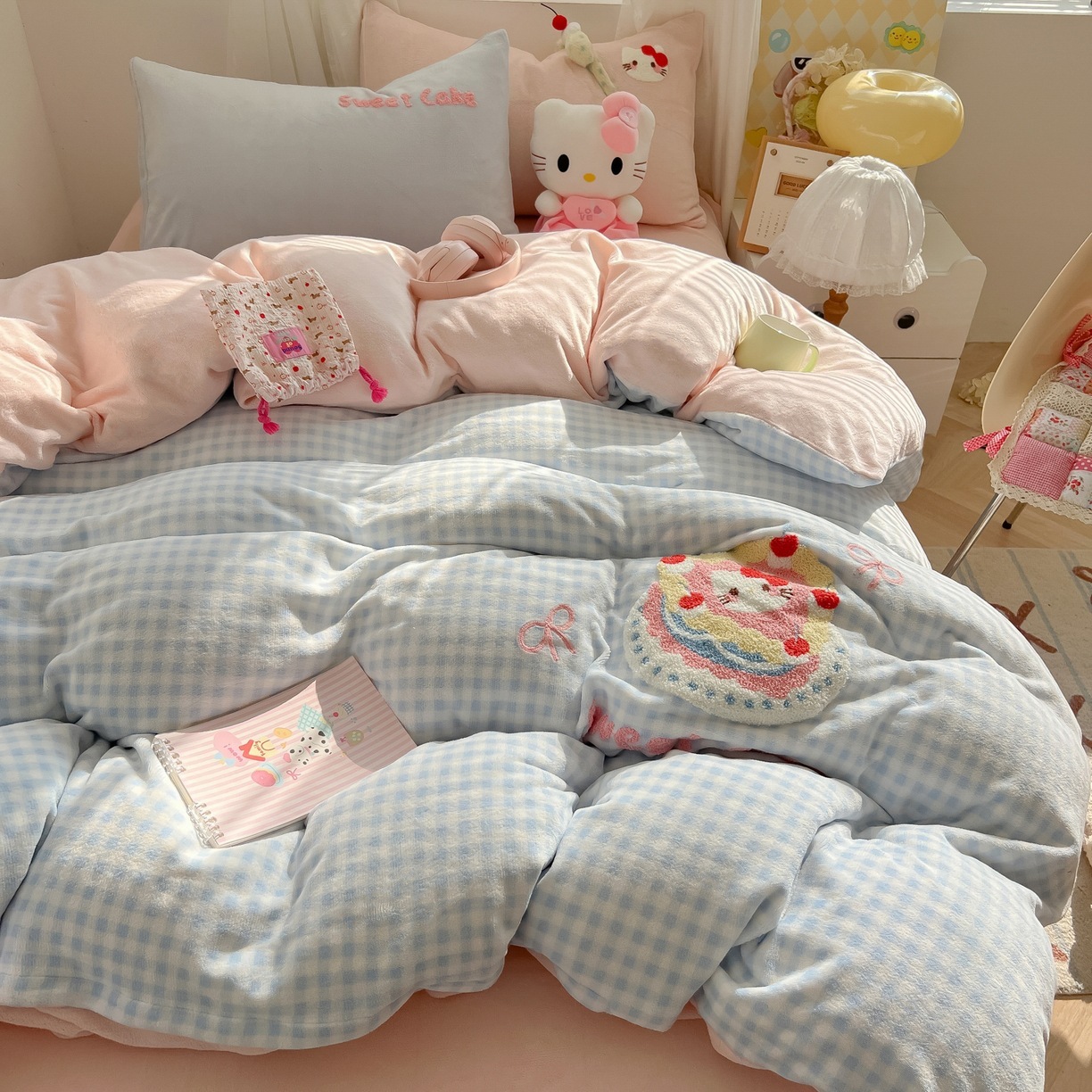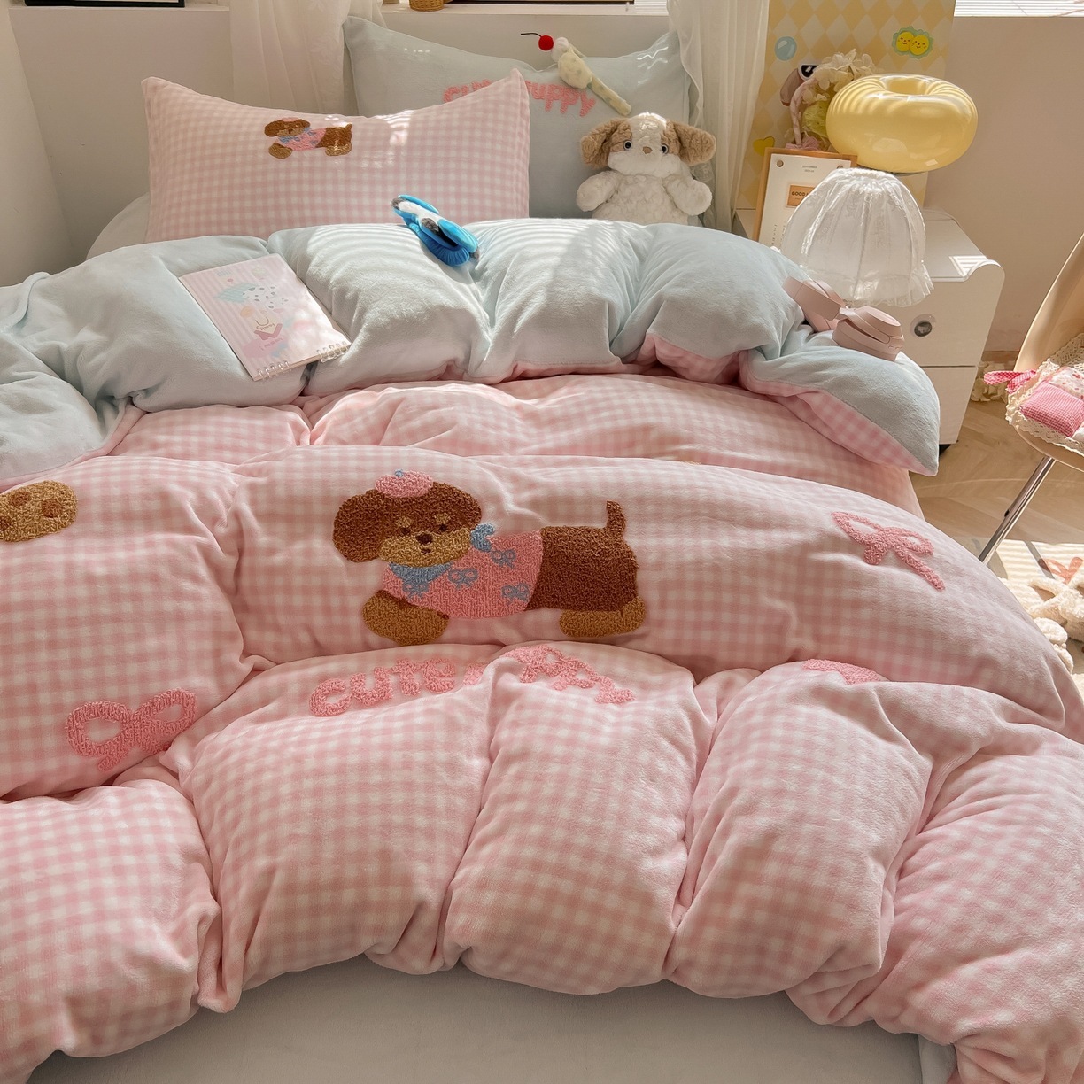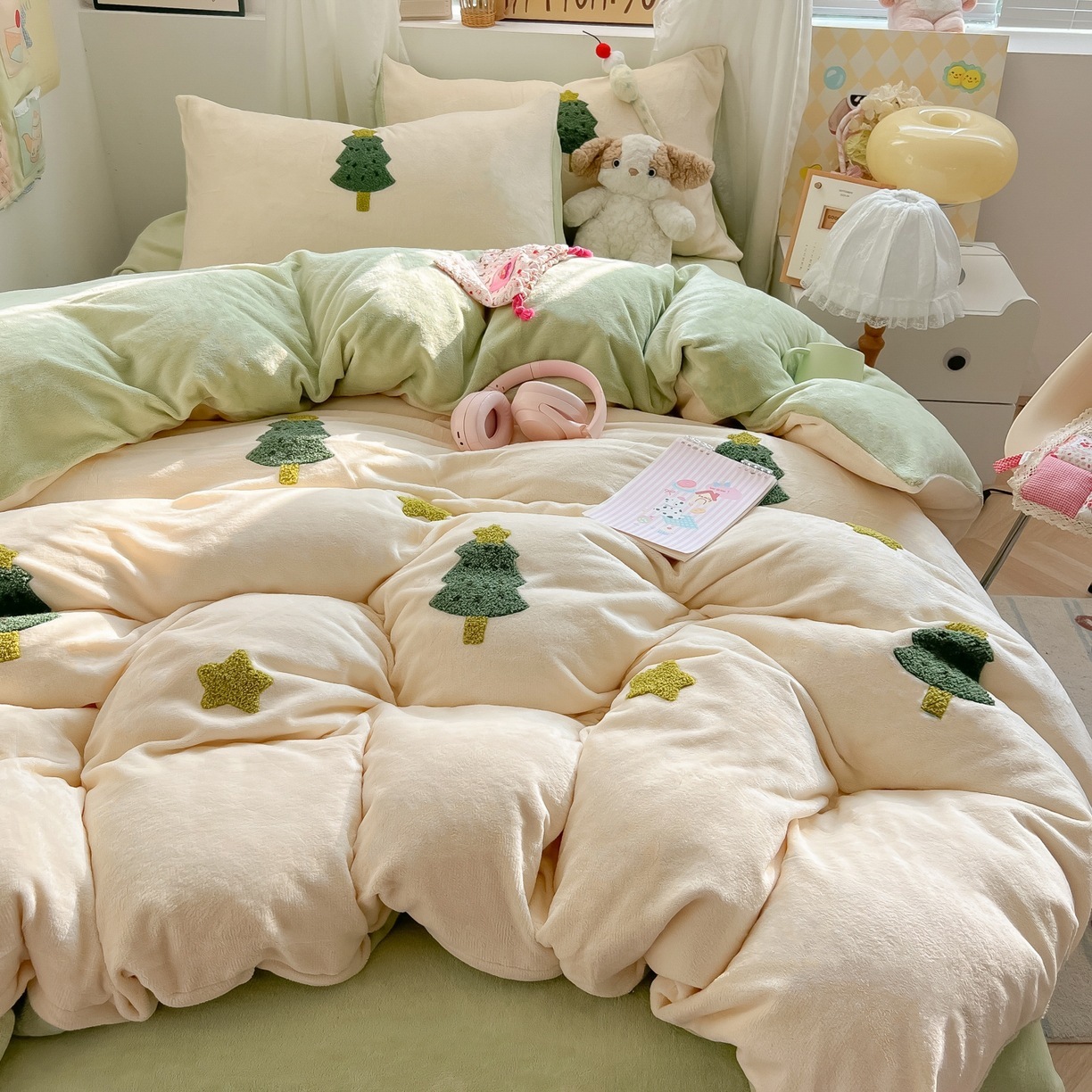 カートゥーン 厚手 ミルクボア 4点セット かわいい タオル刺繍 キッズ コーデュロイボア カバー 学生寮 3点セット