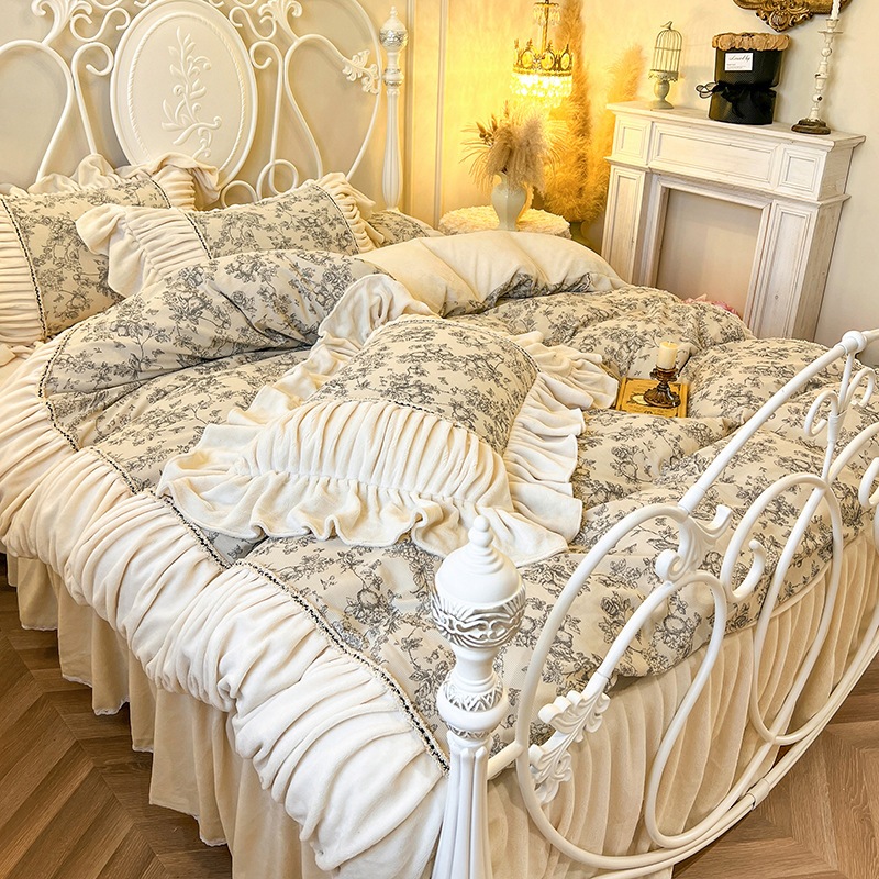 フレンチ田園花卉 ミルクボア 4点セット プリンセス風 ギャザーレース コーデュロイボア カバー 仙女 ベッドスカート