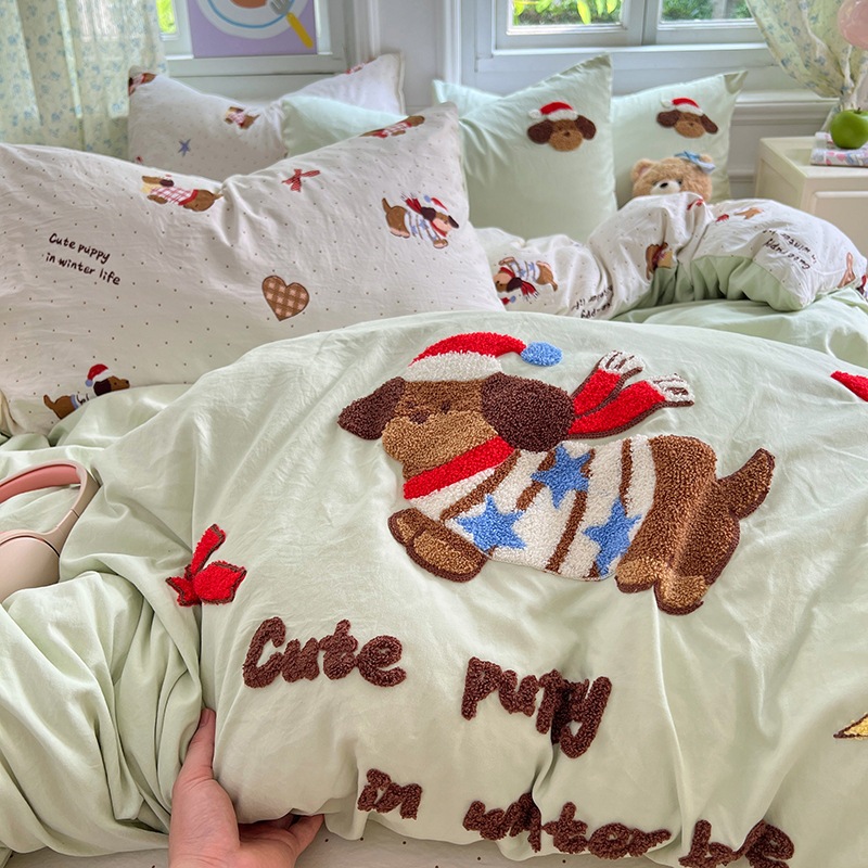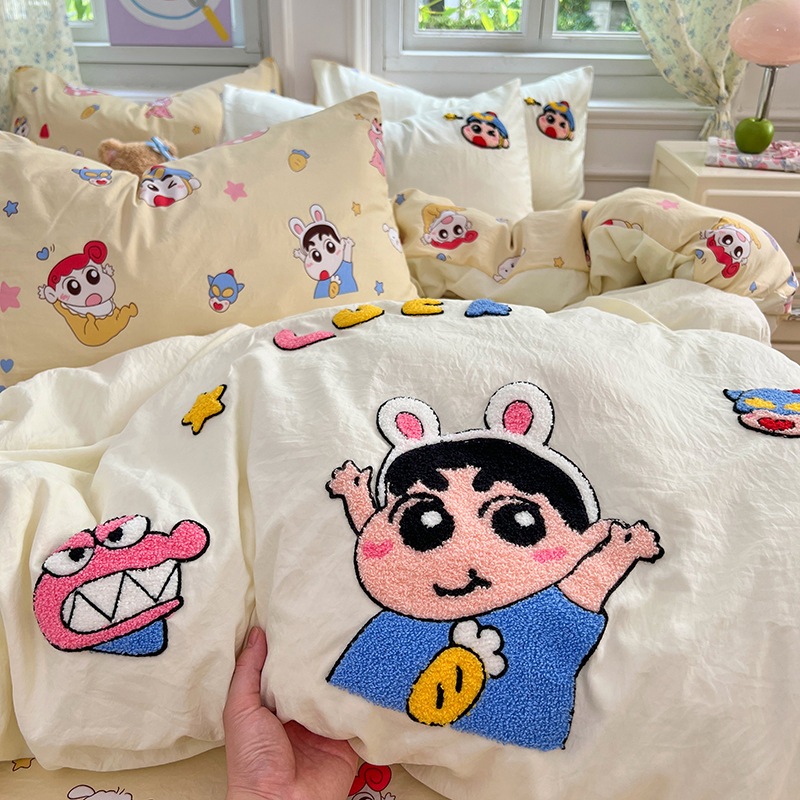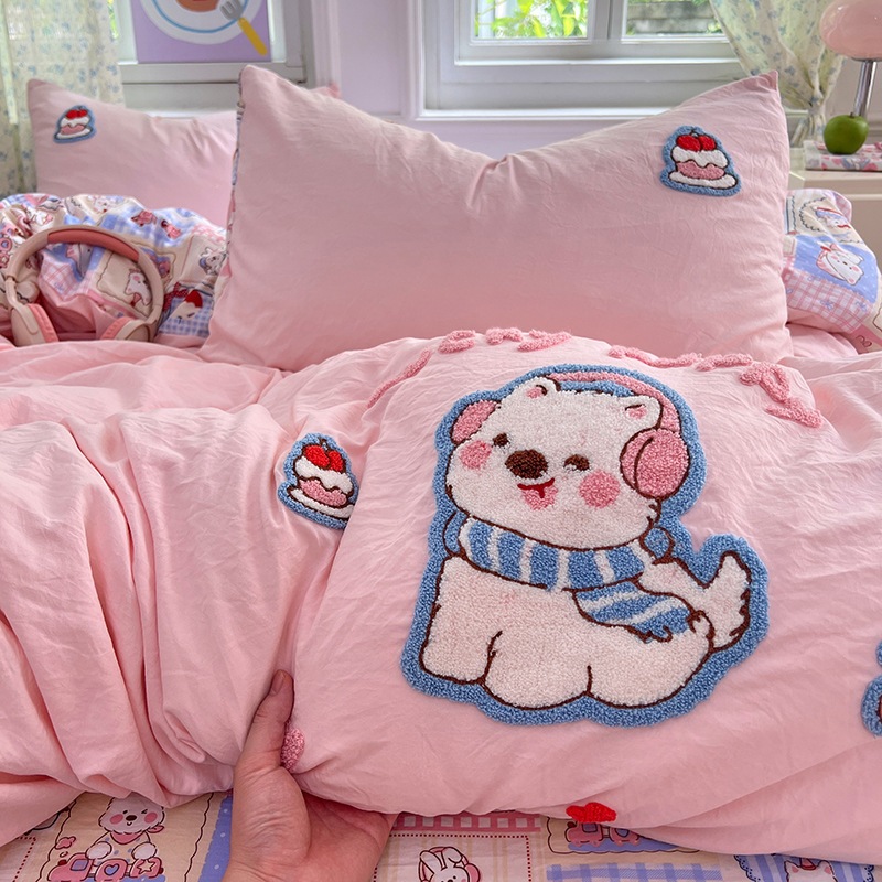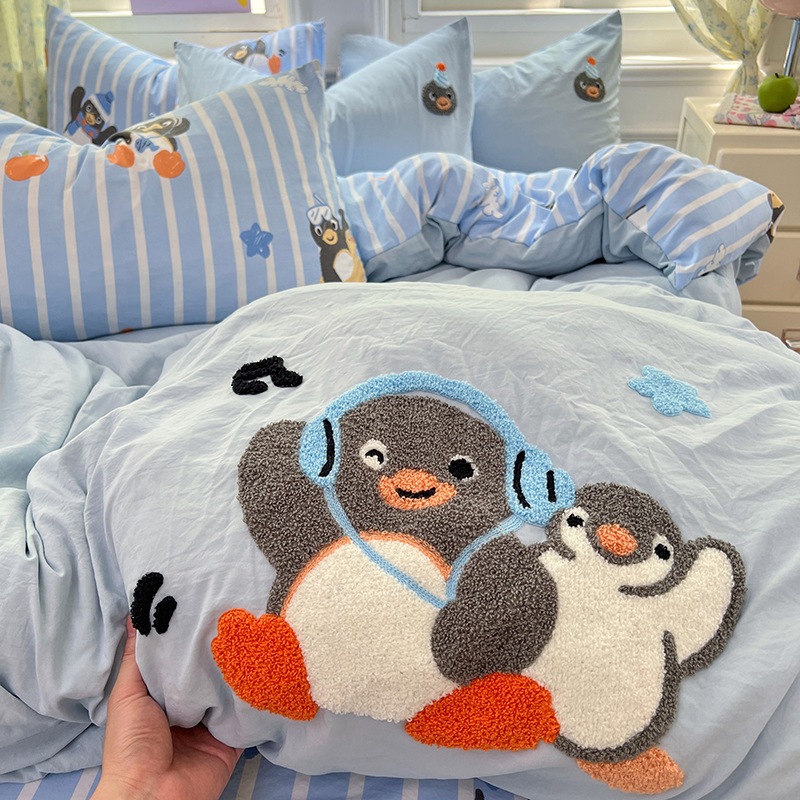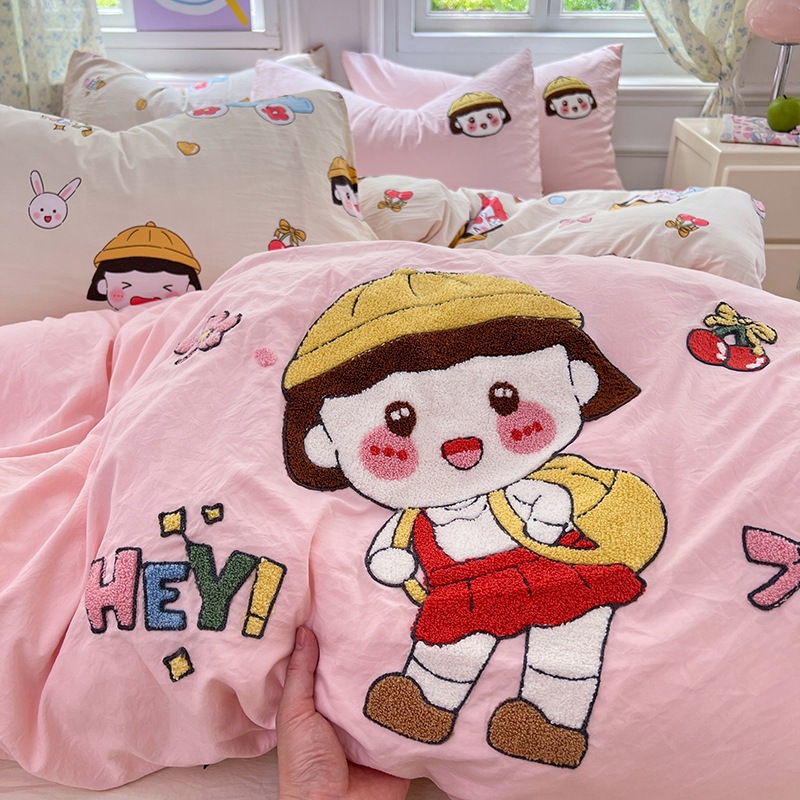 素肌に優しい 純綿 4点セット タオル刺繍 パッチ刺繍 カートゥーン コットン100% シーツ カバー a類 ベッドリネン