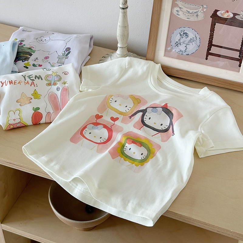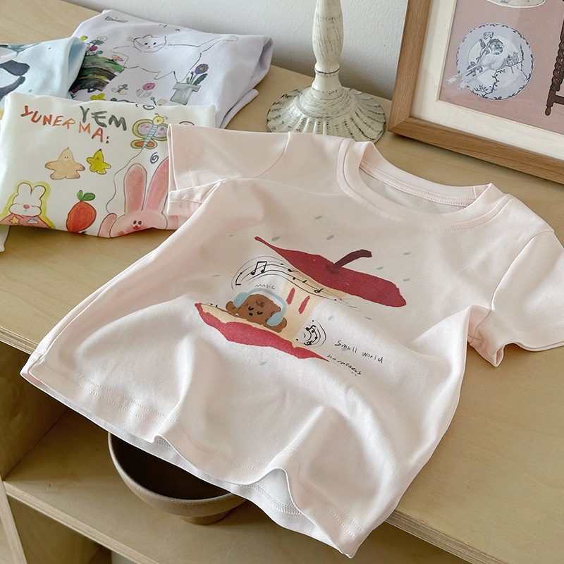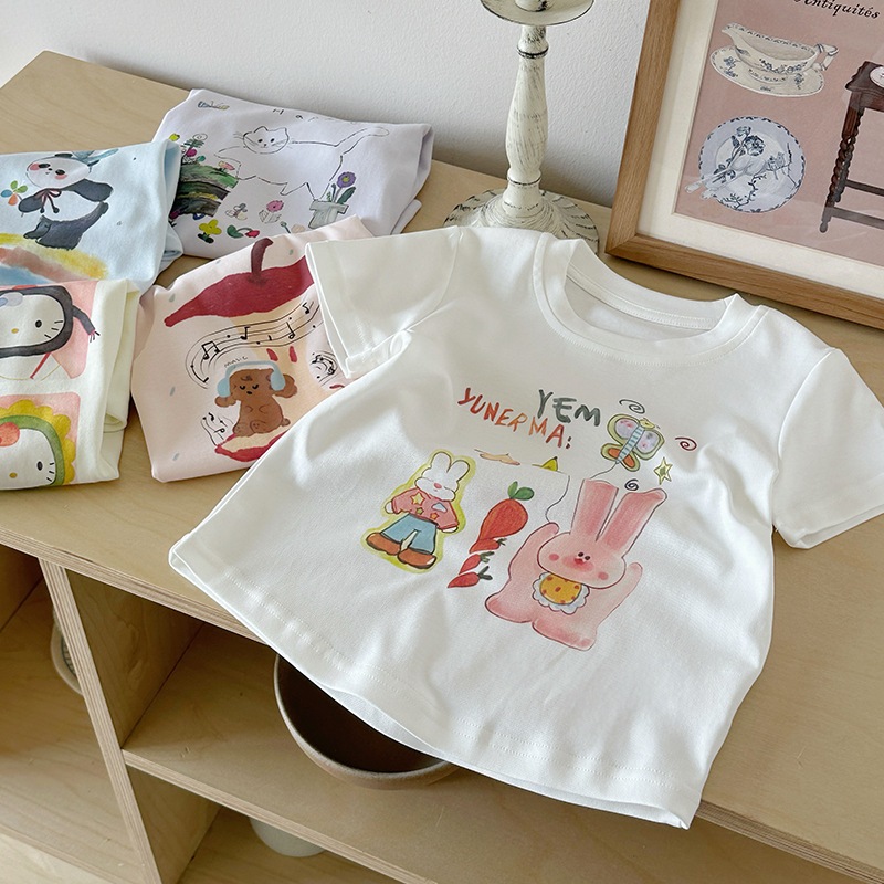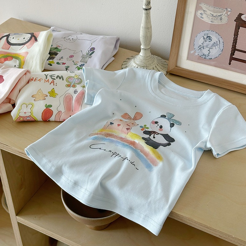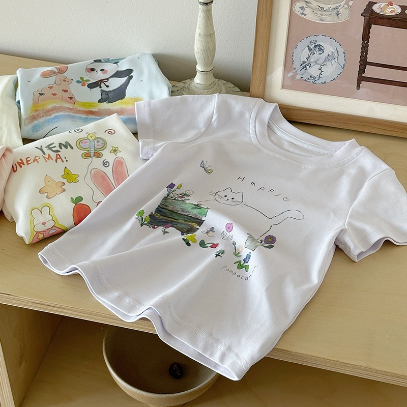 女童 カジュアル キュート 落書き半袖 子供用 通気性 液氨綿 油絵プリント半袖