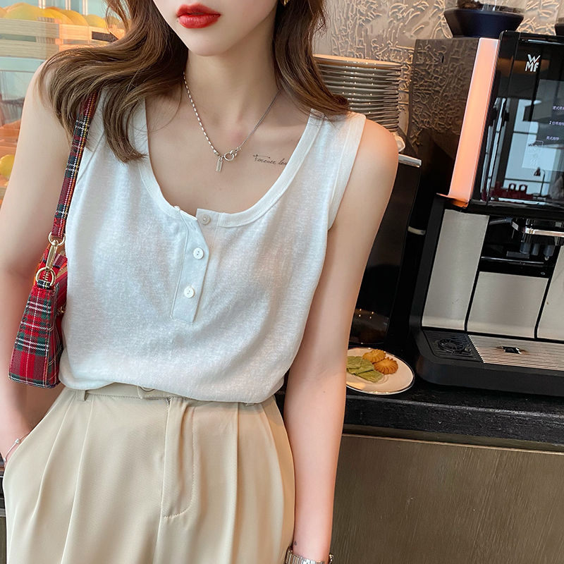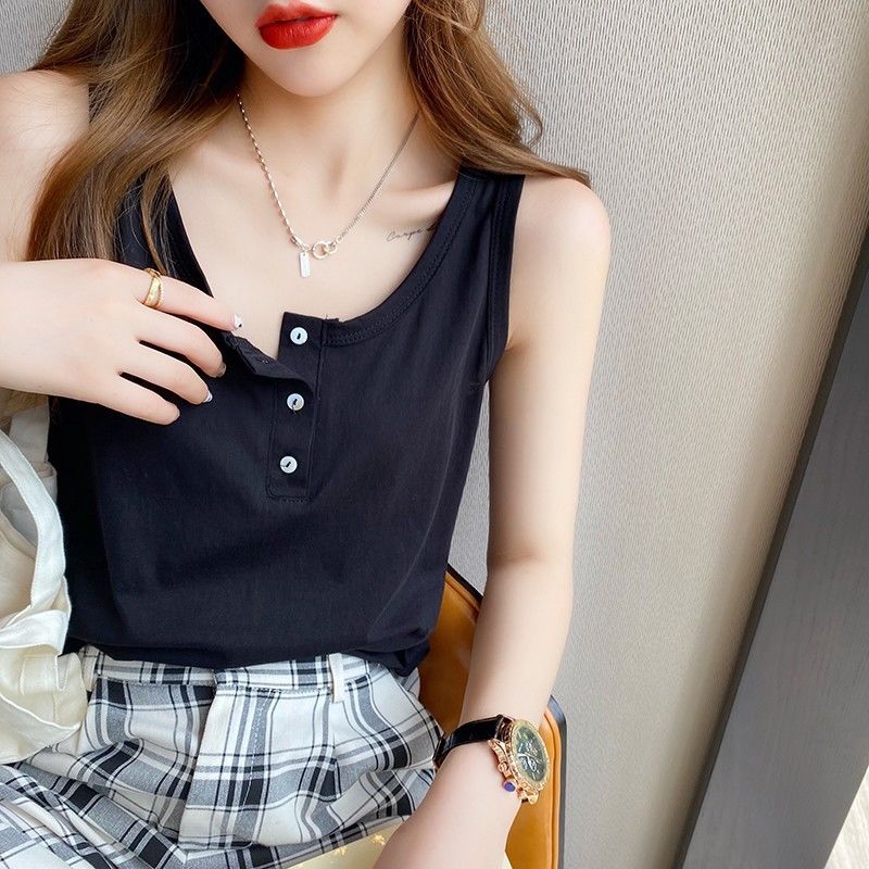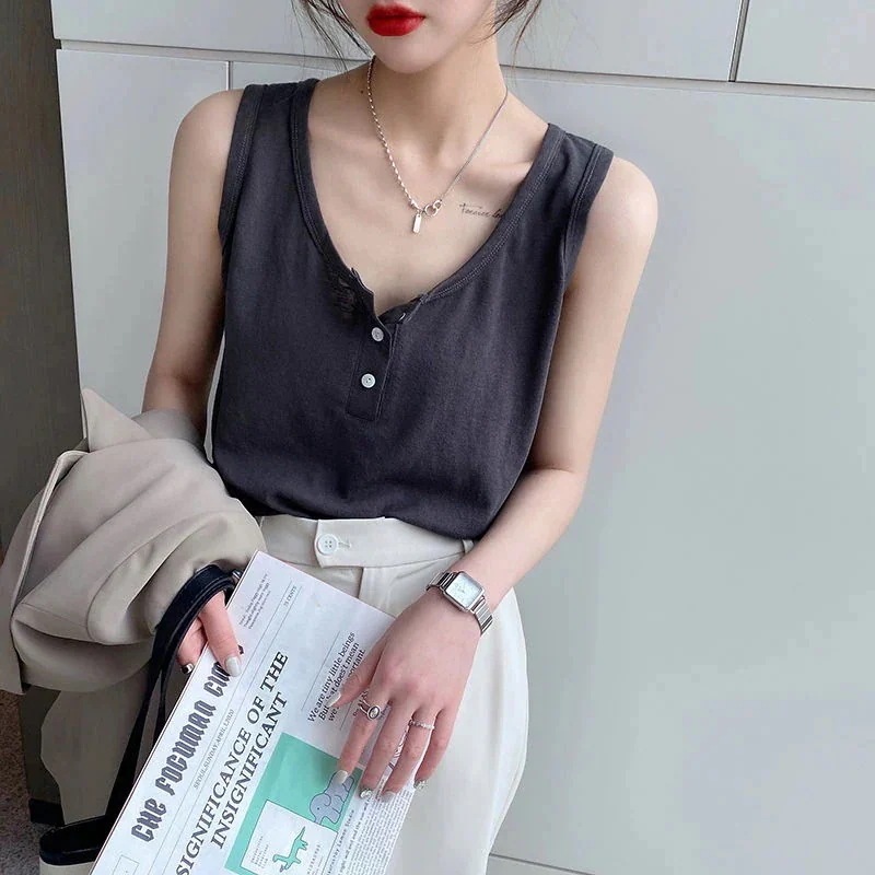 ノースリーブTシャツ レディース キャミソール クルーネック ボタンデザイン トップス ゆったり 大きいサイズ 体型カバー シンプル カジュアル 韓国ファッション 春夏 人気 トレンド おしゃれ