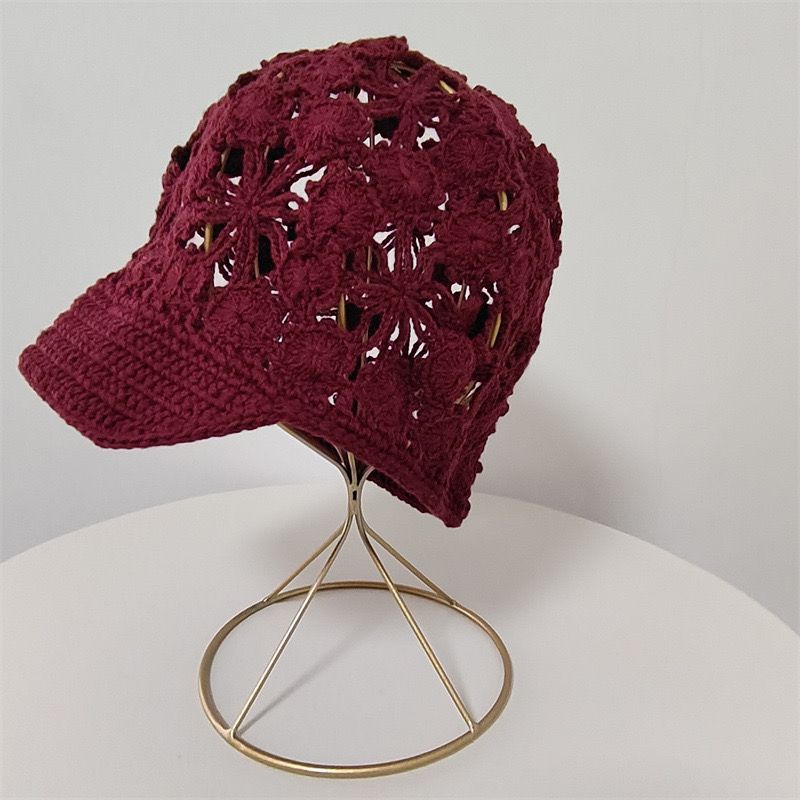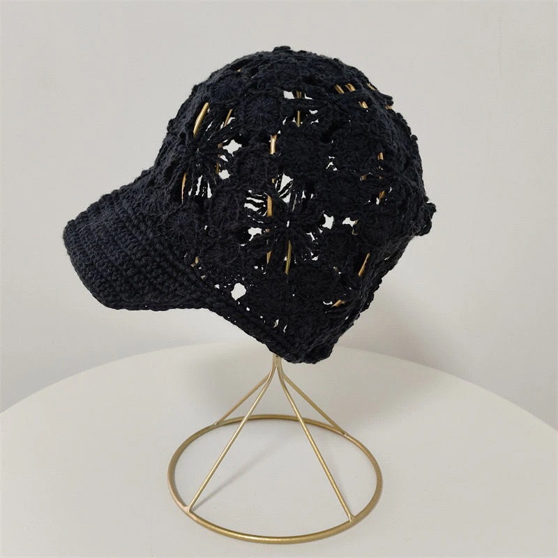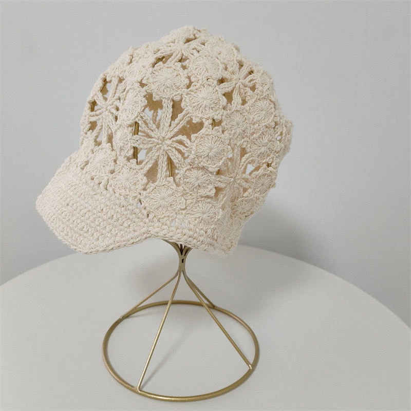 女性用ハンドメイドの透かし編みニットキャップつばが短く顔を小さく見せてくれるデザインエレガントなスタイルで白髪をカバーするレディース用ニット帽