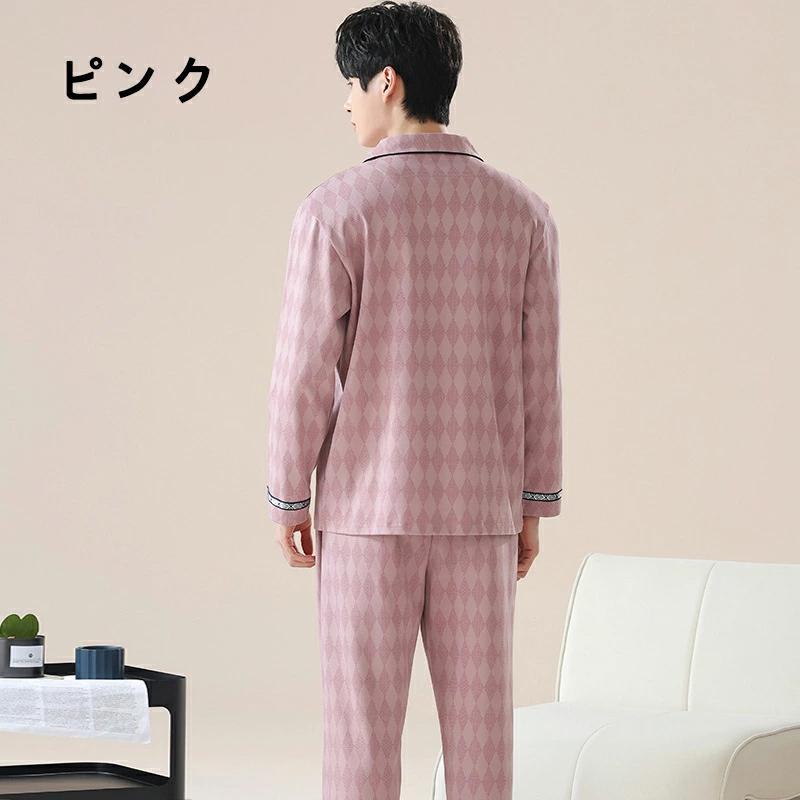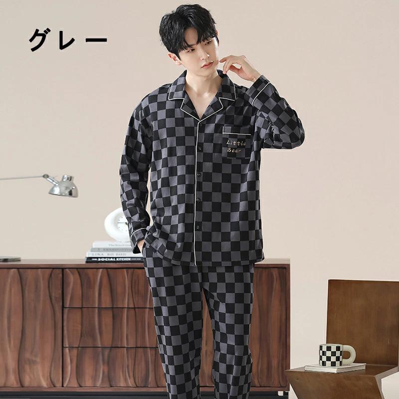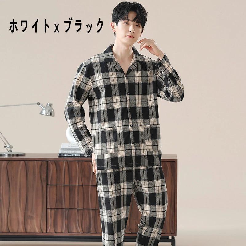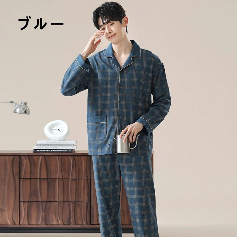 パジャマ 綿 メンズ ボタン 前開き vネック チェック柄 男性用 上下セット 長袖 長ズボン 上下セット 紳士 春秋 薄手 春涼対応 入院 学生息子友人 プレゼント