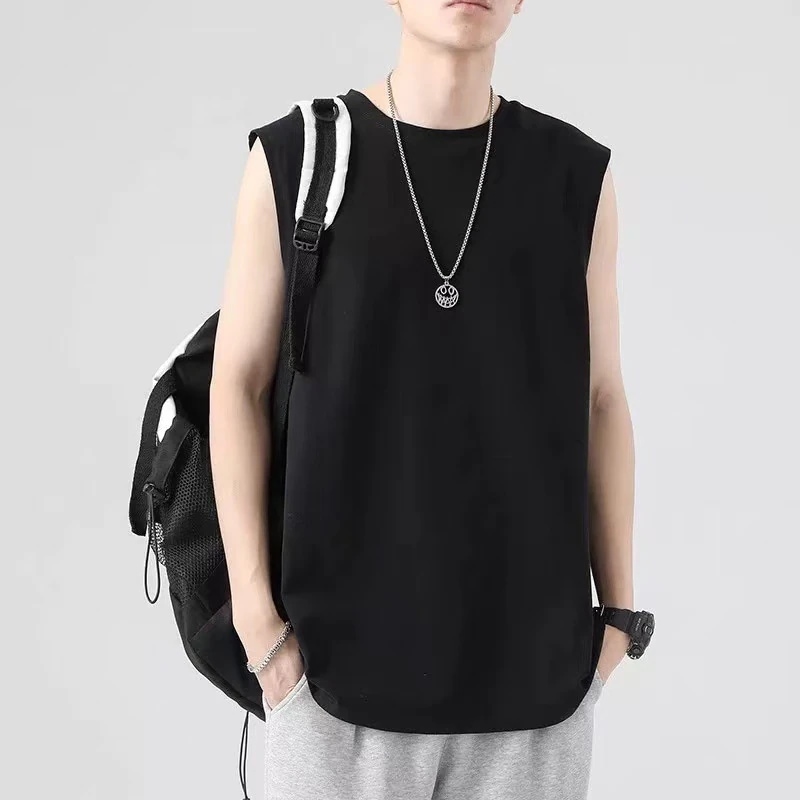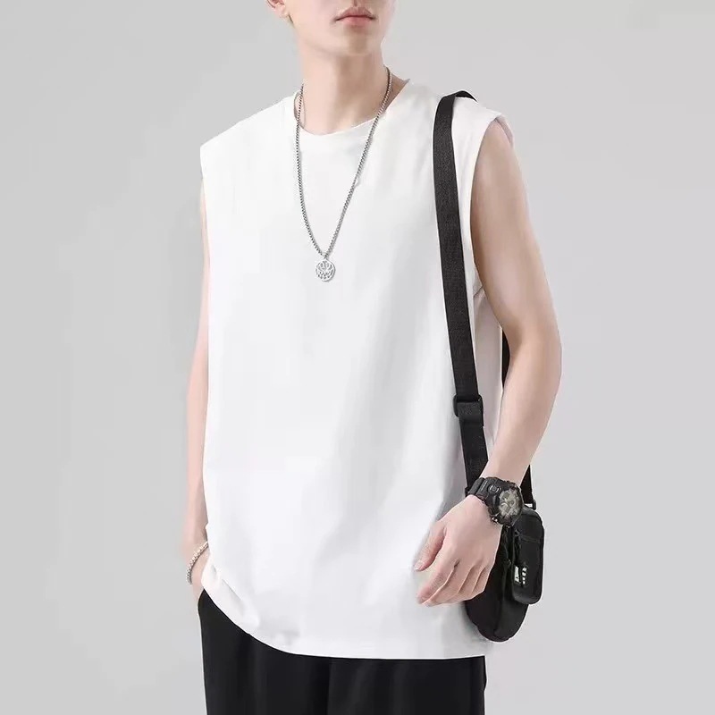 ホワイトの厚手メンズタンクトップ 夏用 ティーン向けベーシックデザイン ルーズフィット 香港スタイル ノースリーブTシャツ カジュアルなインナー インスタ映え
