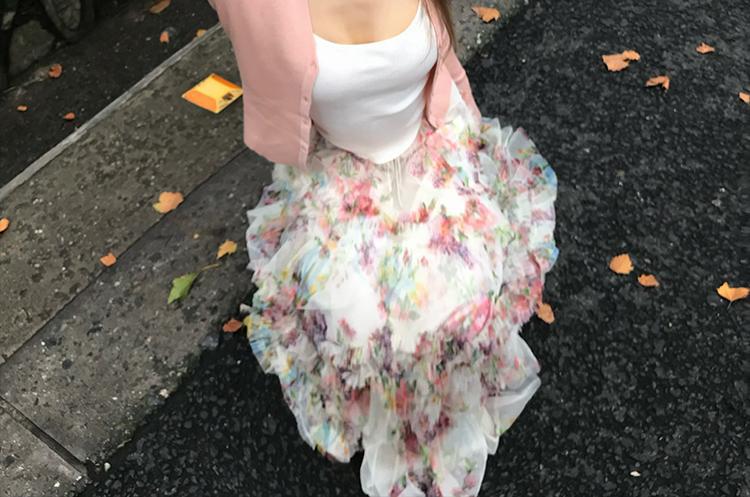 ビーズ刺繍 不規則 チュール ローズ 柄 ティアードスカート レース パール シルエット 優しい風 ロング丈