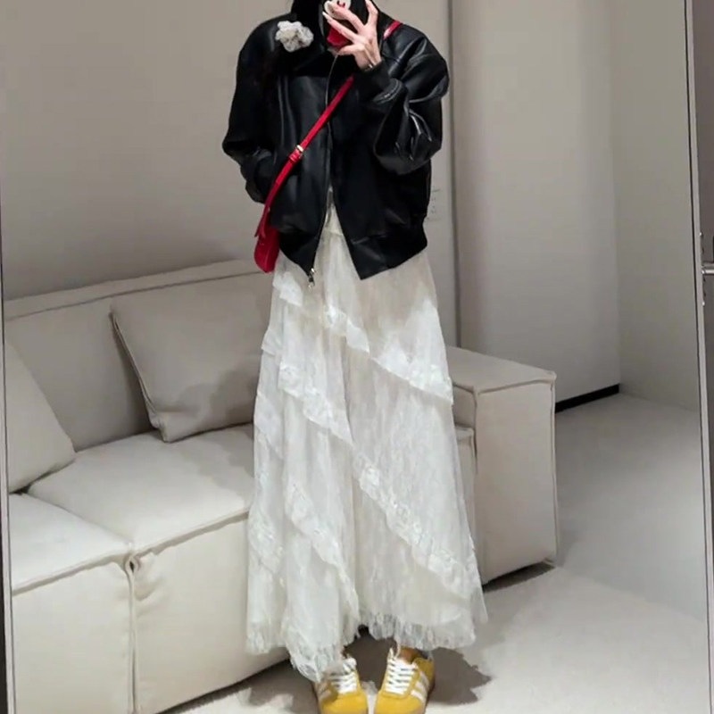 チュール レイヤード 斜めレース レース 花柄 スカート レディース ホワイト ティアード 高ウエスト Aライン