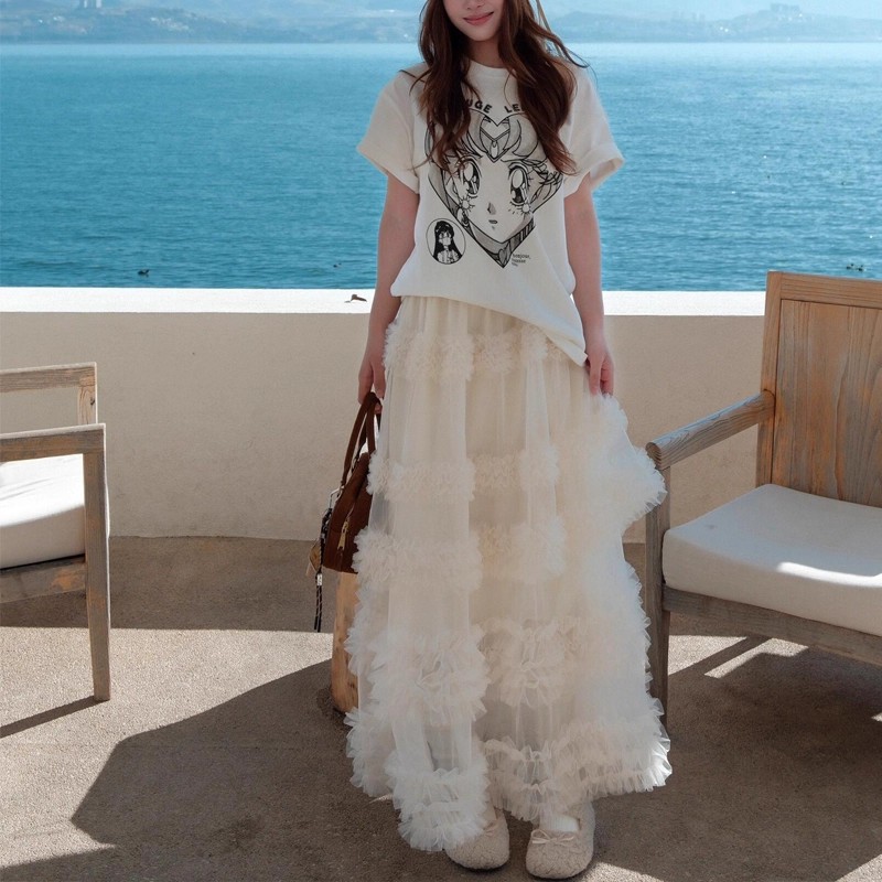 バレエ風 チュール レイヤード ティアードスカート レディース フェアリーパニエ ホワイト フレンチスタイル ロング丈