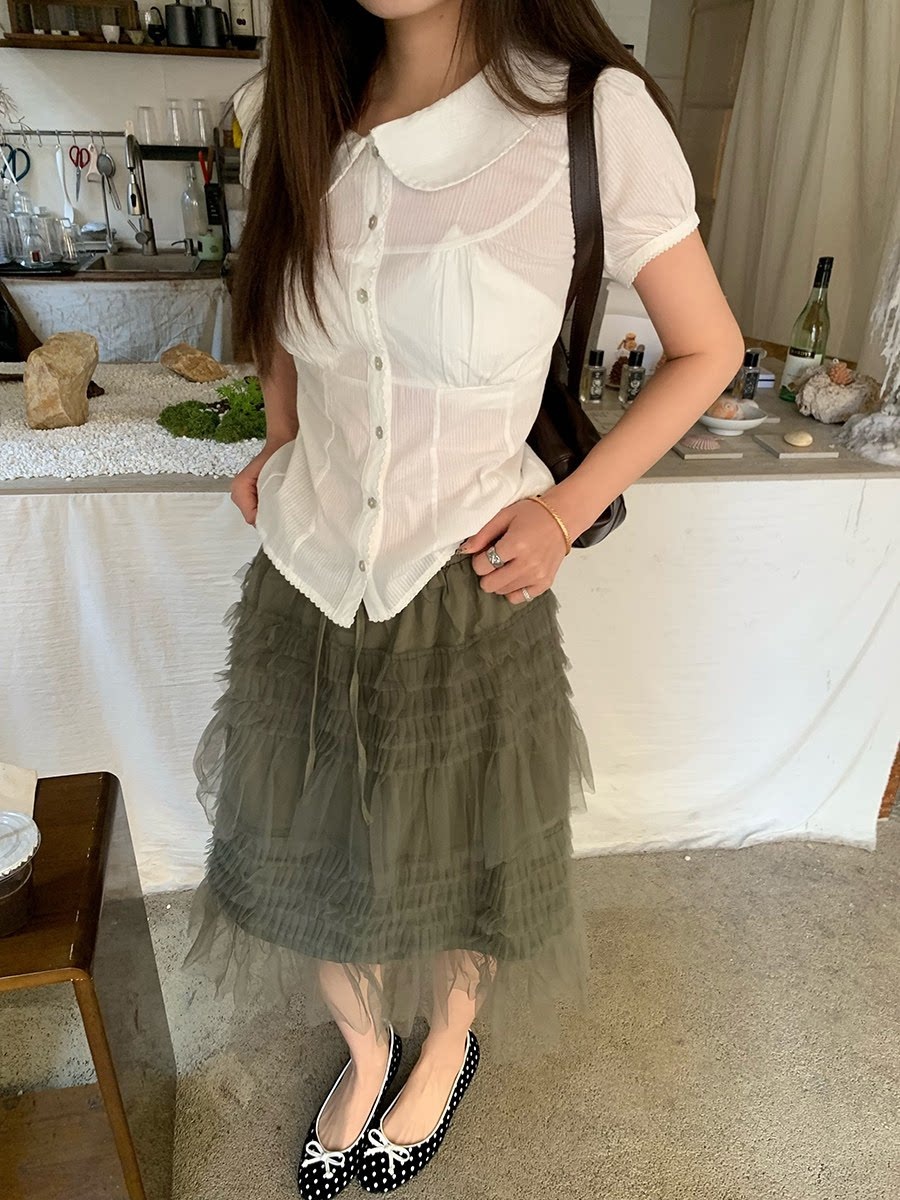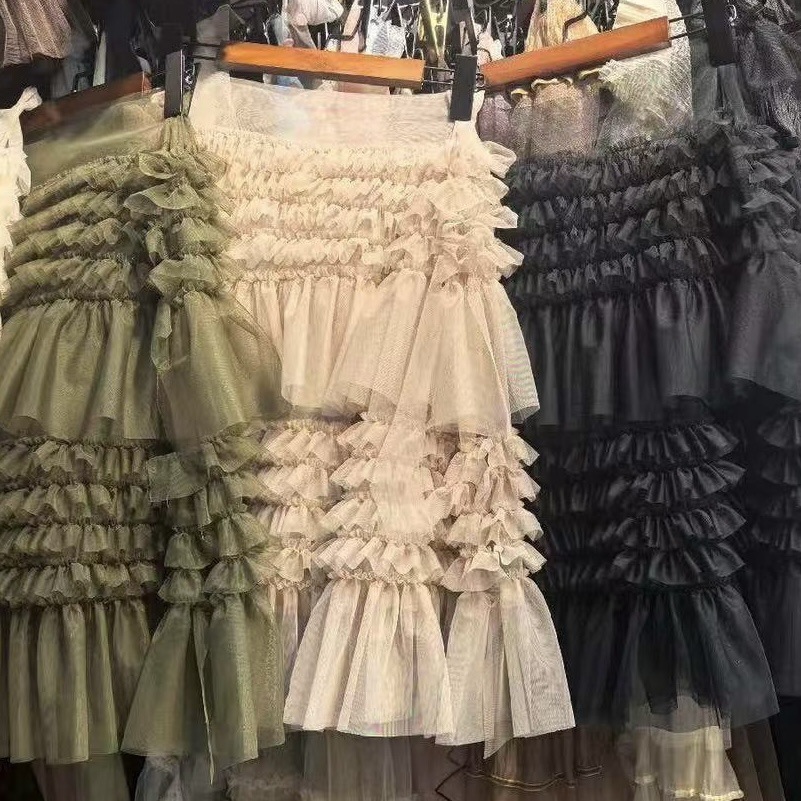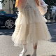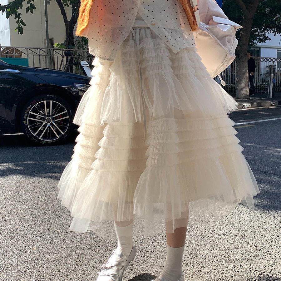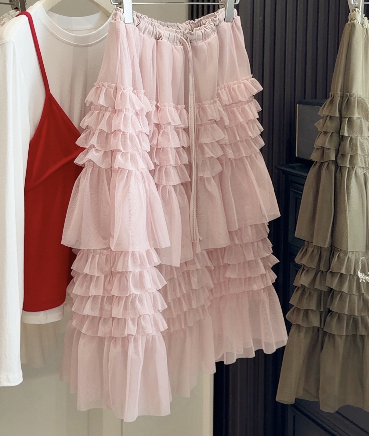 多層チュール 高ウエスト Aライン ティアードスカート 重め ピコット 甘め フリル パニエ風 ミディ丈