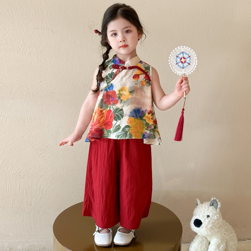 女児用新中華風スーツ夏の唐装漢服ベビー用ノースリーブ夏服2点セット