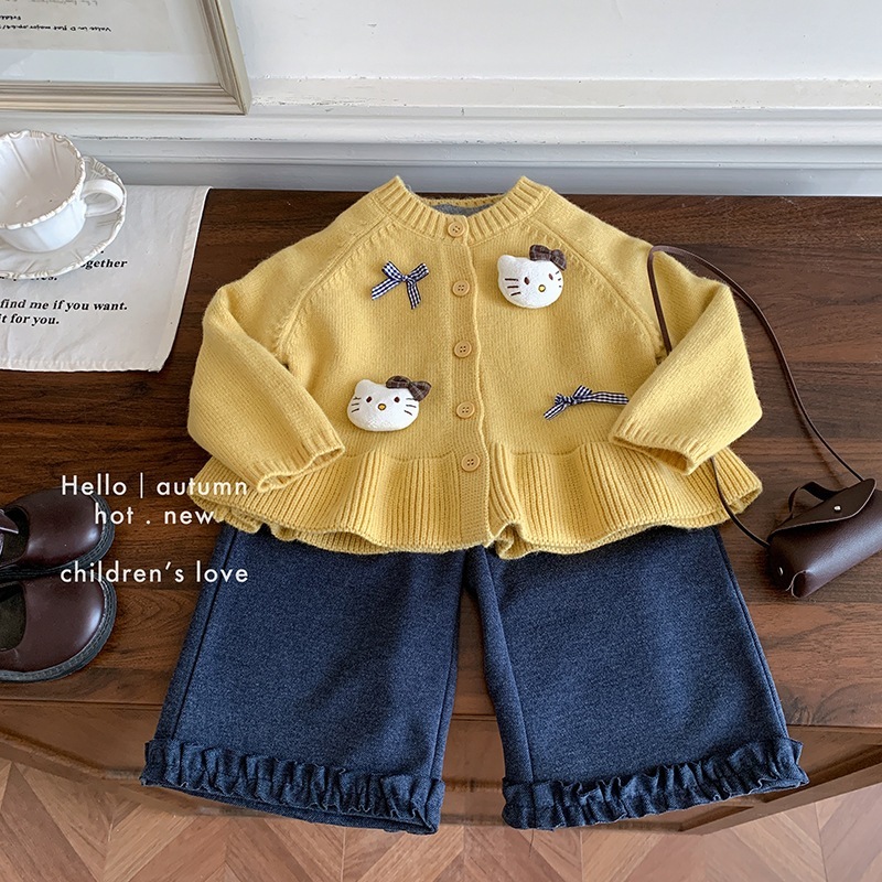 女の子用ニットベスト秋の子供服レースのドールカラートップスインナーシャツワイドレッグパンツの3点セット