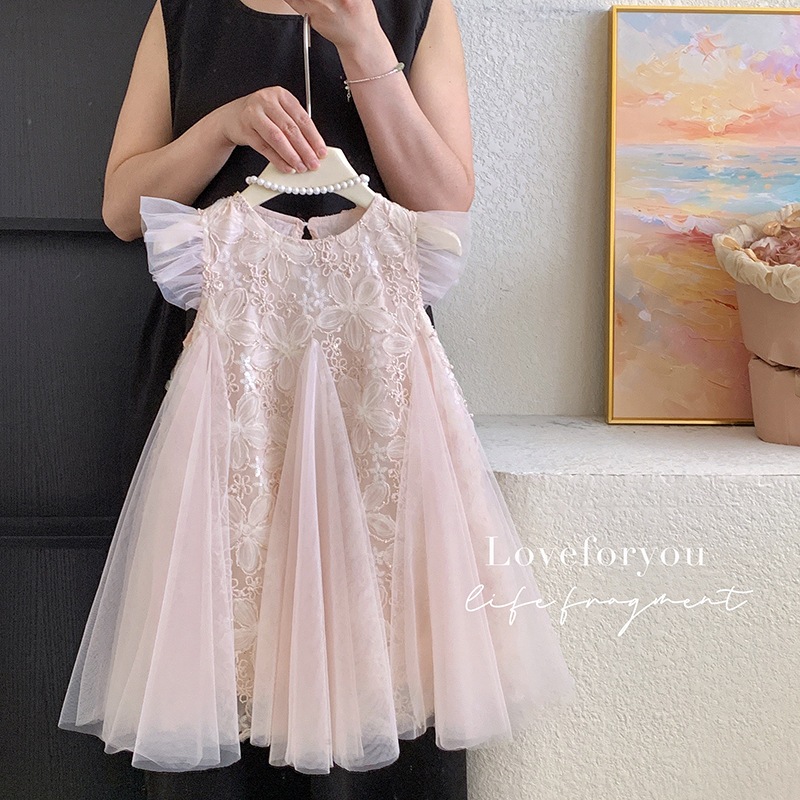 夏の女の子用小飛袖立体花柄プリンセスリボンメッシュ