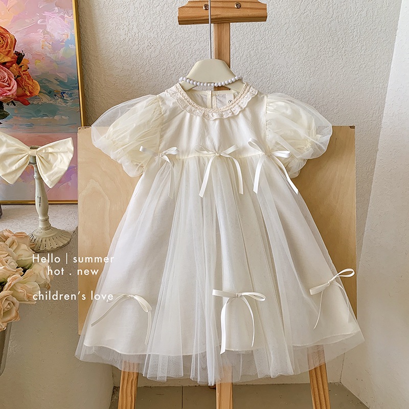 女の子用夏おしゃれなパフスリーブメッシュスカート甘い雰囲気のプリンセスドレス