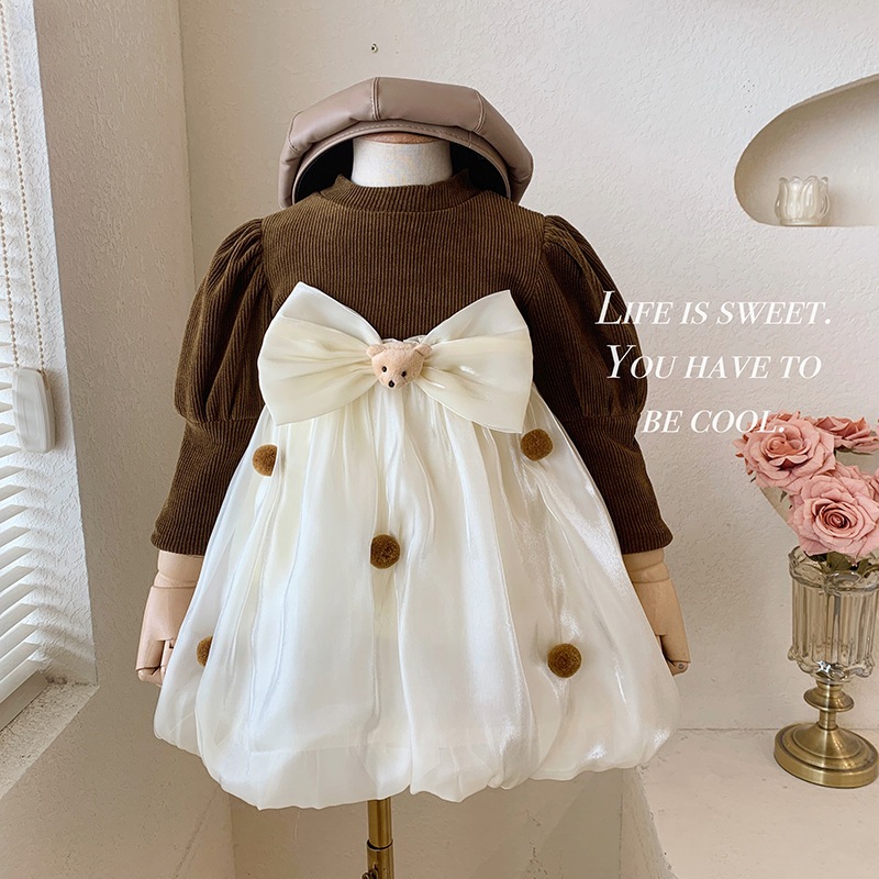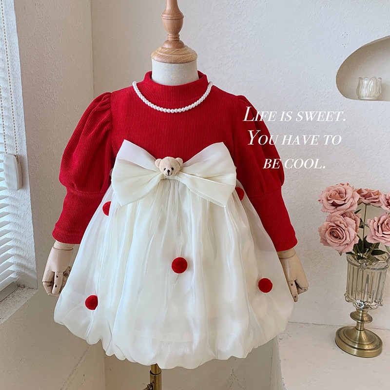 女の子用 冬の おしゃれなフェイクツーピース 長袖 裏起毛 厚手 クマ柄ベビー