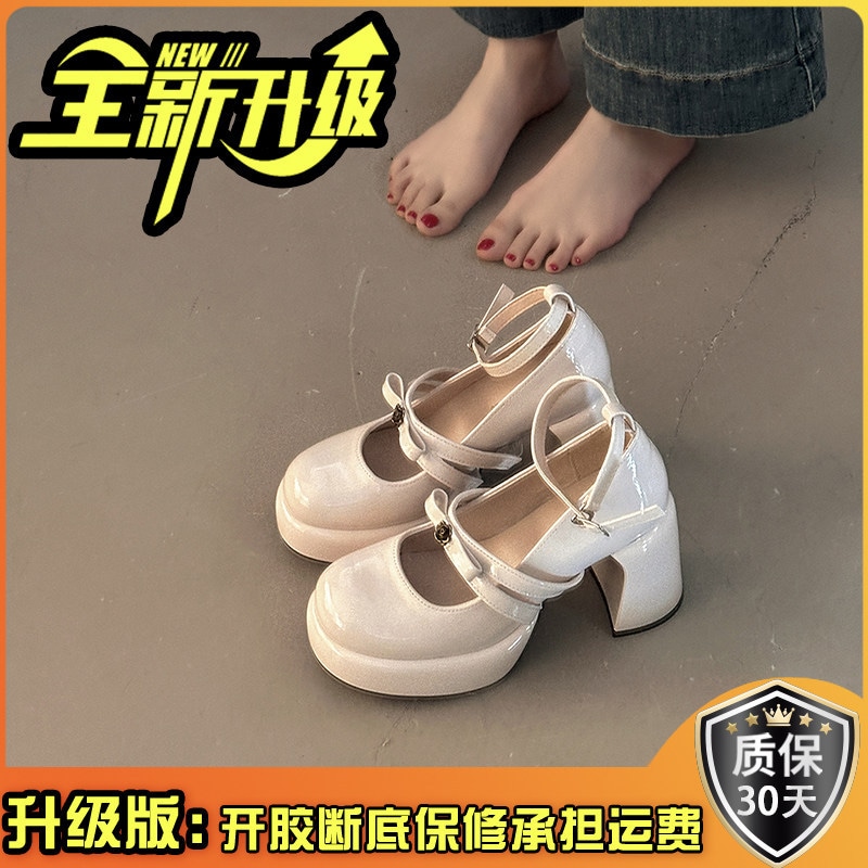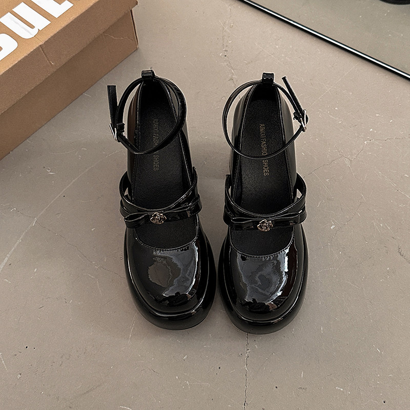 マイナー 上品 靴ひも 漆皮 靴 おしゃれ レトロ ストラップバックル パンプス 太めヒール えり足 カジュアルシューズ