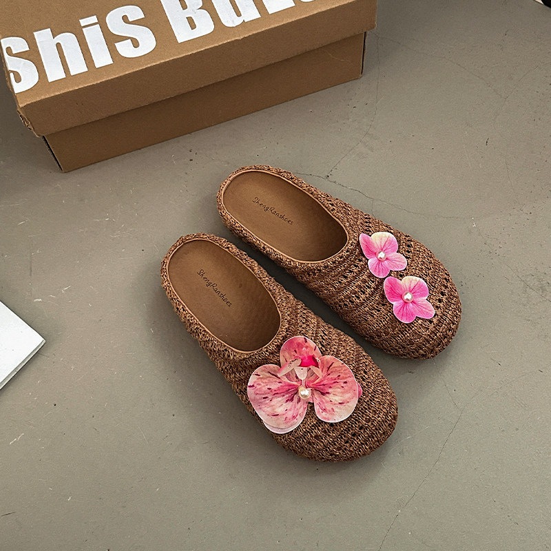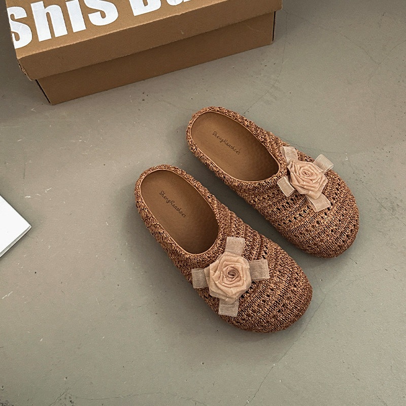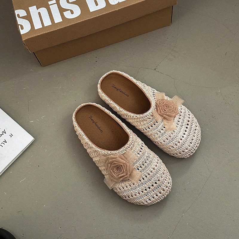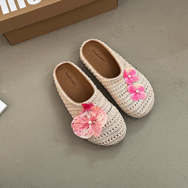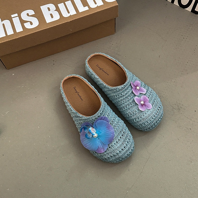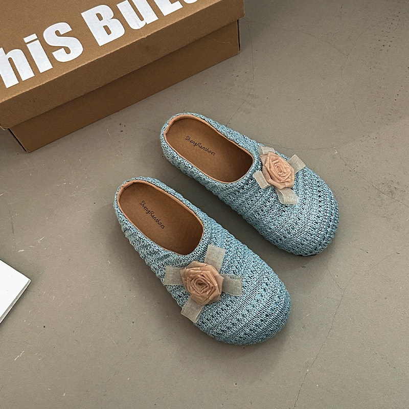 優しい 編み つま先カバー サンダル 女性 ビロード 上品 かわいい 屋外 花 飾り スリッポン 滑り止め ミュール