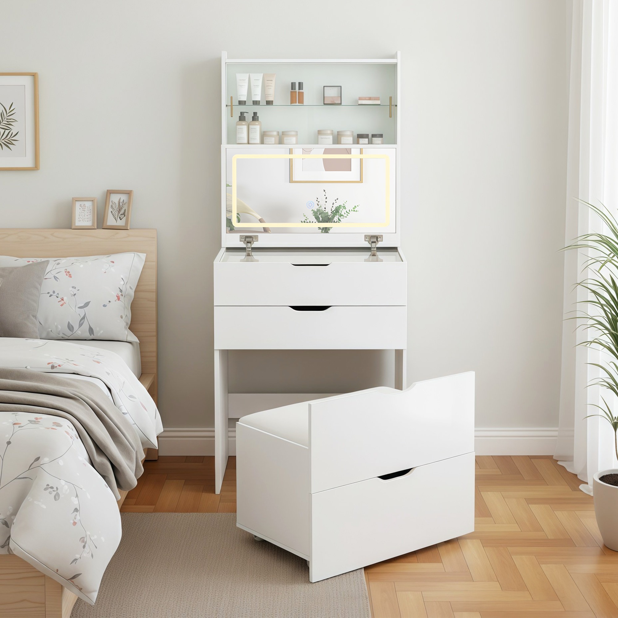 507国内入荷済!!ドレッサー 2WAY天板 無段階調節LED女優ミラー 3色切替 ガラス扉キャビネット コンセント付き USBポート搭載 引き出し付き 省スペーススツール付き 大容量収納 化粧台 メ