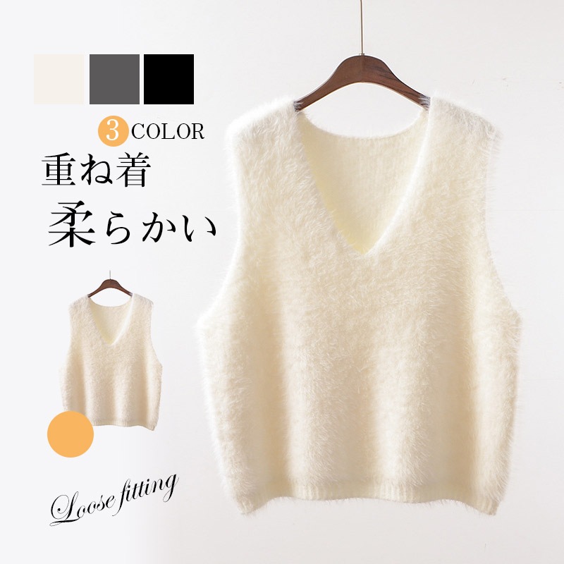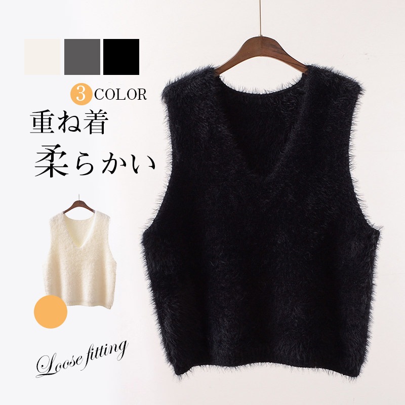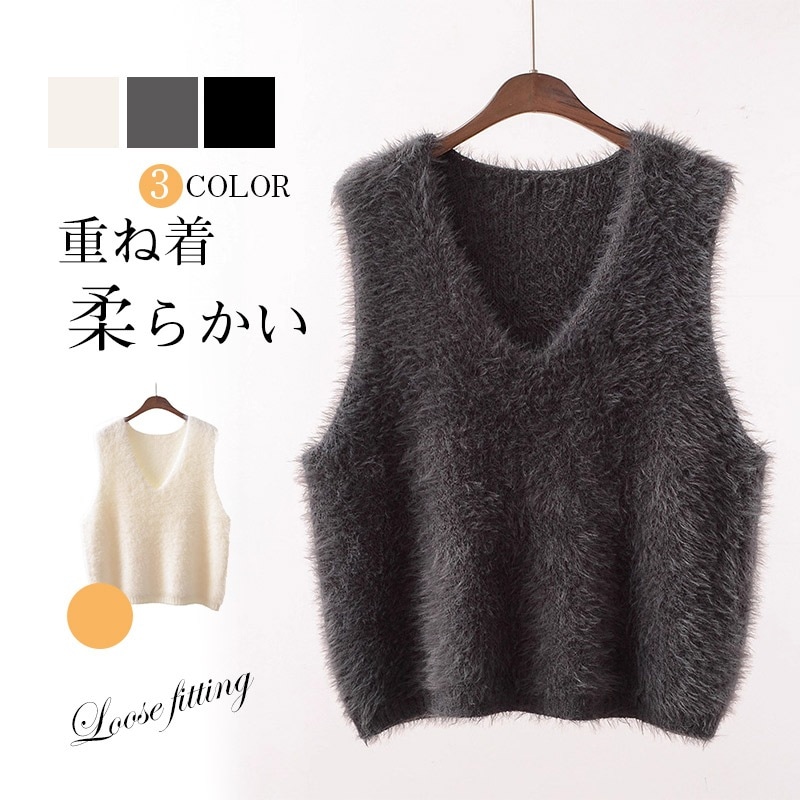 ベスト ニットベスト レディース 秋冬 重ね着 ファーベスト ニット Vネック レイヤード トップス 毛足長め プルオーバー 防寒 保温 爆買