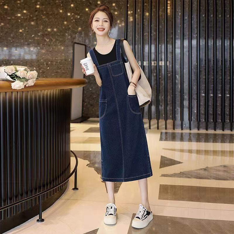 おしゃれで洋風なデニムサロペットスカートレディースミディアム丈夏新作韓国風体型カバーすっきり見せるワンピーストレンド