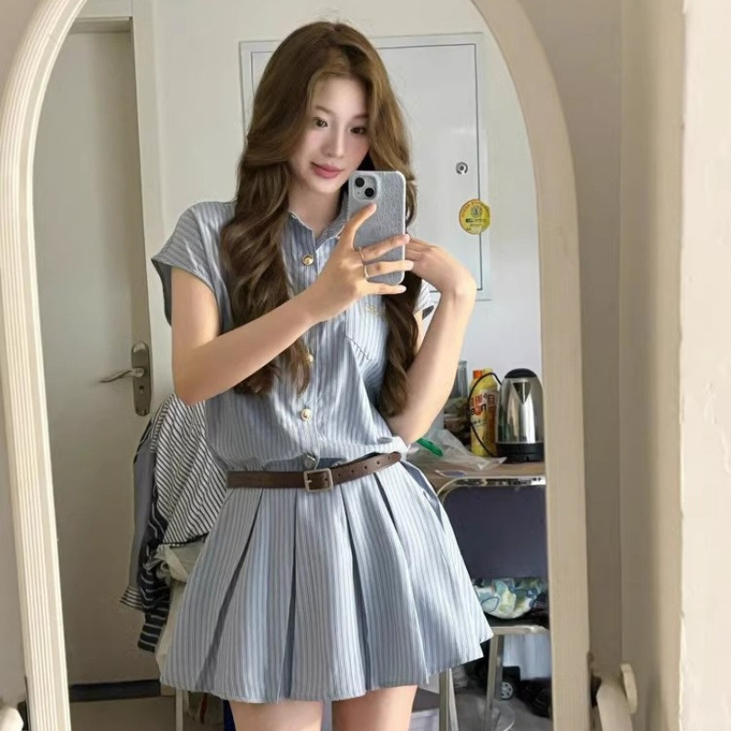 韓国風ラグジュアリーな雰囲気漂うポロネックのストライプシャツワンピース女性用夏シェイプアップ効果小柄さん向けプリーツスカート