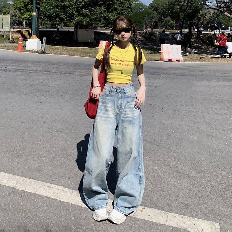 アメリカンヴィンテージウォッシュドルーズワイドレッグハーレングインズ女性用ハイウエストゆったりカジュアルほっそり見えデニムパンツ