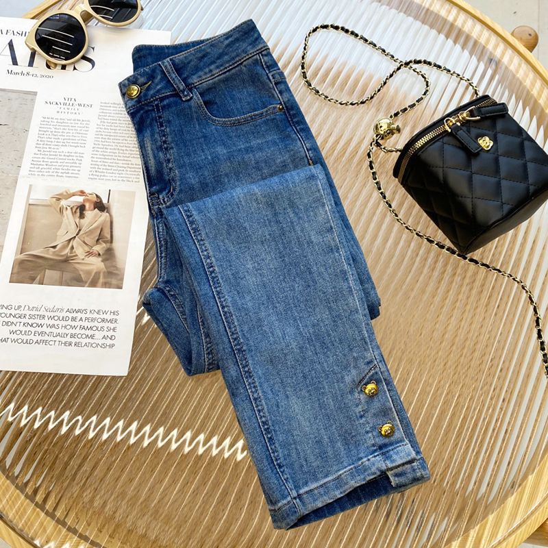 スモーカーデニムパンツレディース春秋新作ハイウエスト着やせゆったり小柄さん向けネイビッド版ストレートカット