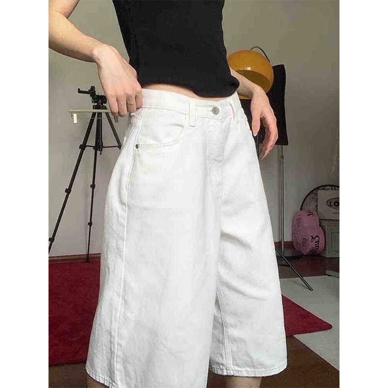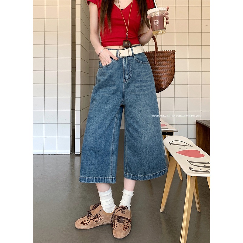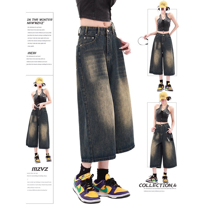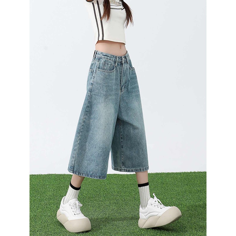 レトロハイウエストワイドクロップドデニムパンツレディース夏新作ゆったりルーズシルエットストレートパンツミドルレングス