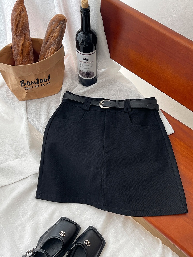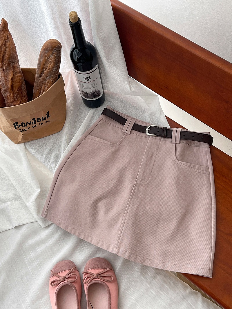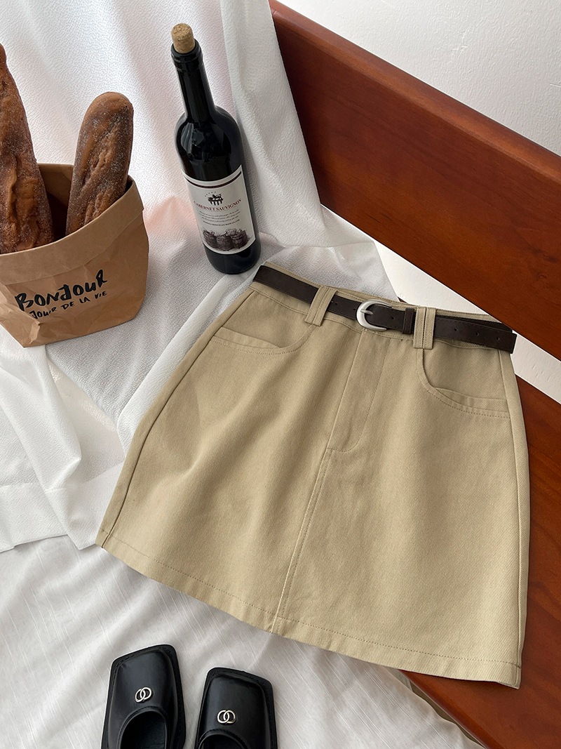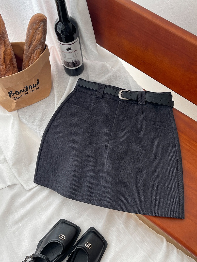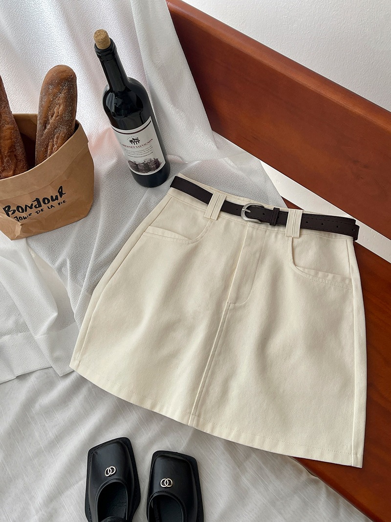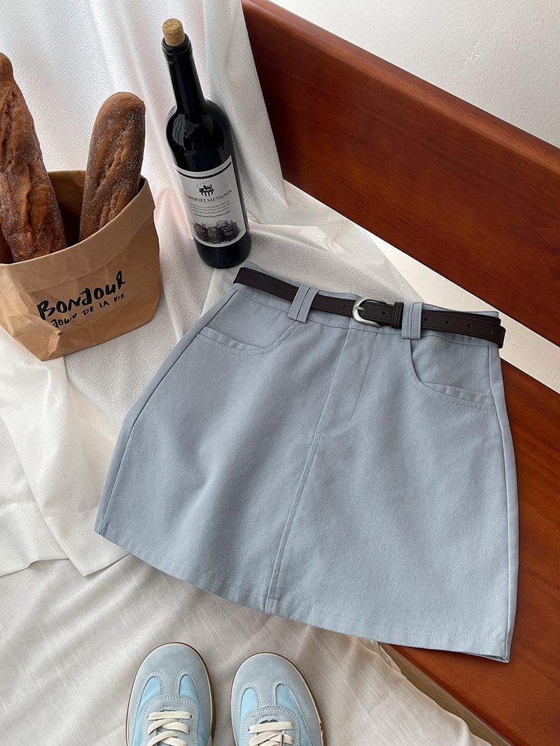 韓国シックデニム水洗いコットンショートスカート女性春夏エレガント日系着やせヒップハングAライン万能ミディアムスカート