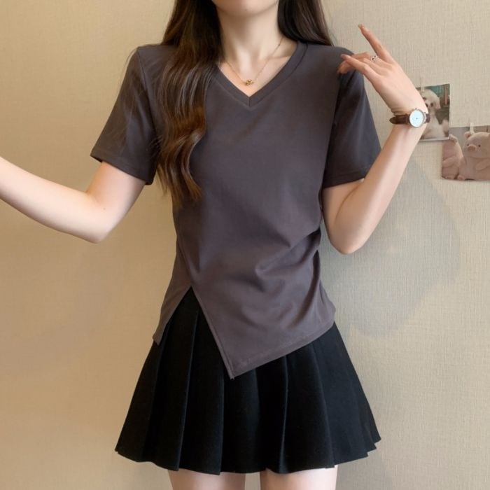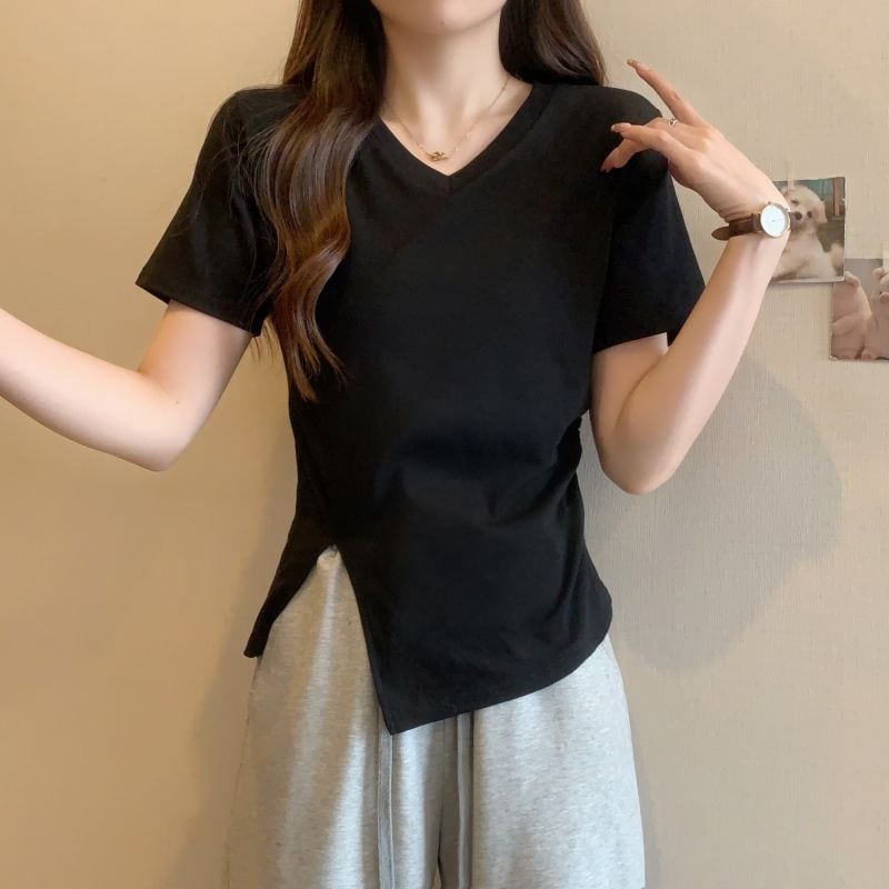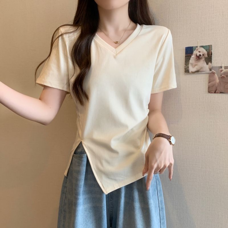 【2点購入で 1OO円OFF!】大きいサイズのデザイン不規則なスリットの半袖Tシャツ夏に女性用太ったMM腹をカバーし細く見える白いストレートショルダートップ F