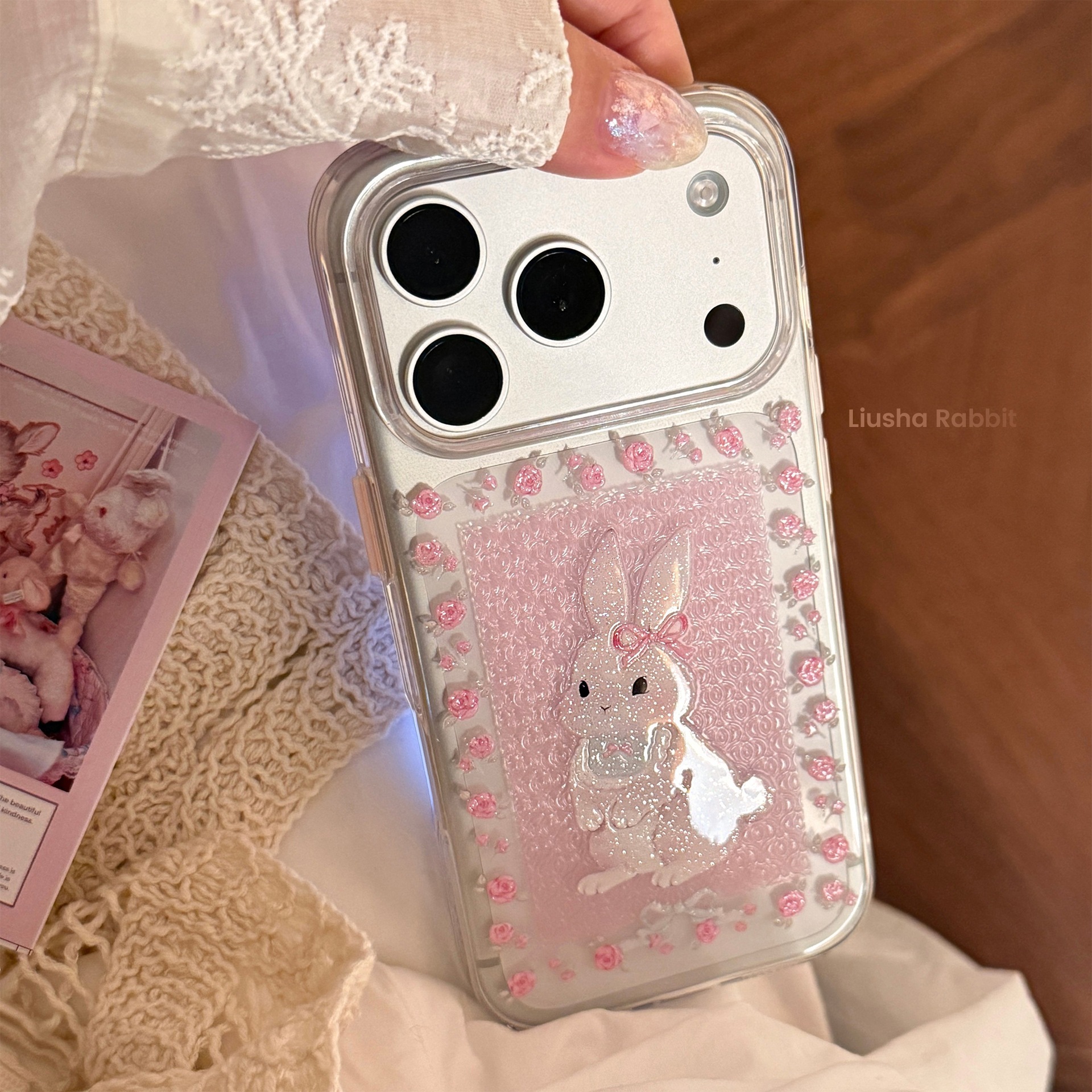 キュートうさぎ iPhone17 対応 スマホケース 16Pro クリアラメ小花柄 13 ガーリーキャラクター 15