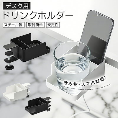 デスク用ドリンクホルダー カップ置き コップホルダー スマホ収納 リモコン収納 充電対応 デスク横 2in1 省スペース デスクを広く使える 整理整頓 インテリア 取付簡単 工具不要 黒 白 高級感