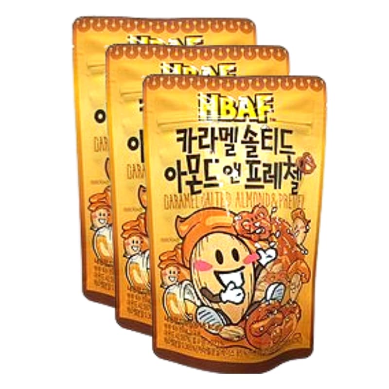 HBAFキャラメルソルテッドアーモンド&プレッツェル 120g×3袋 韓国お菓子 ナッツスナック 甘じょっぱい キャラメル味 おやつ 人気