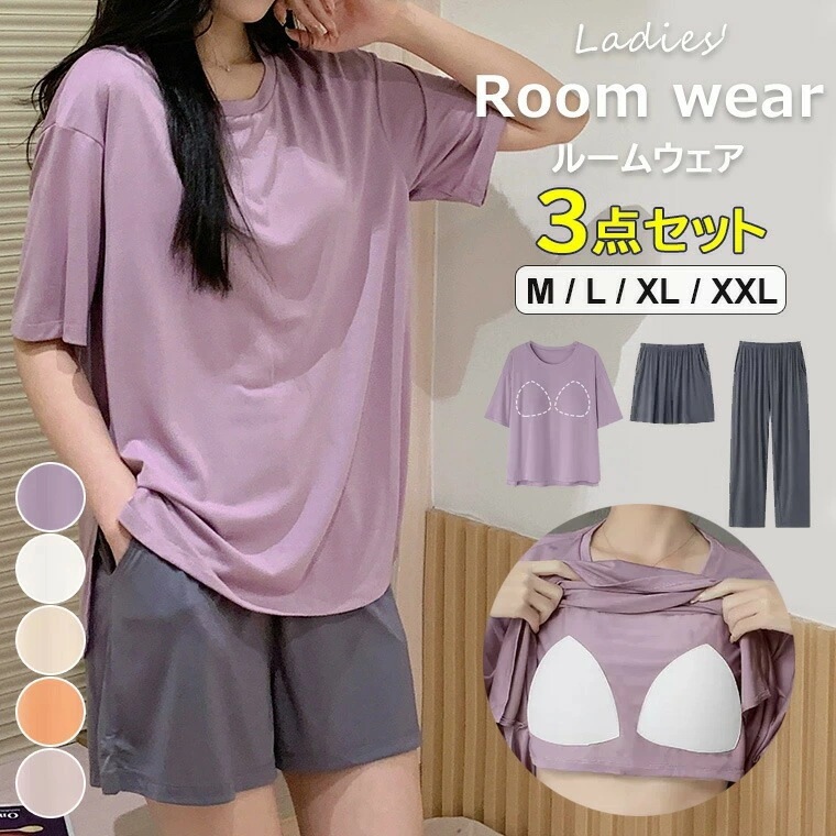 ストレスフリーカップ付き 3点セット 半袖トップス+ショートパンツ+ロングパンツ レディース パジャマ 部屋着 ルームウェア 半袖 短パン 上下セット ナイトウェアストレスフリーカップ付き 3
