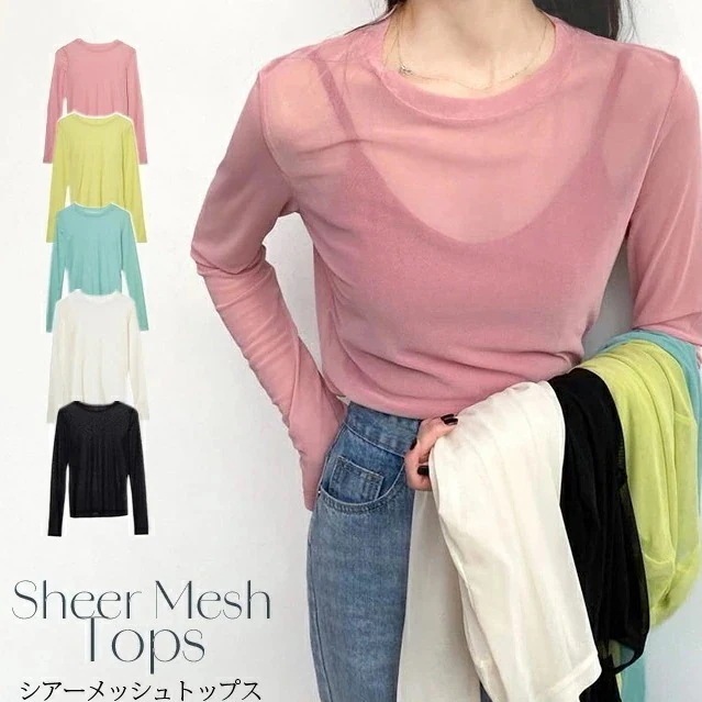 シアーメッシュトップス シアートップス メッシュトップス レディース 長袖 薄手 透け感 インナー 重ね着 レイヤード カットソー 春夏秋 無地 大人可愛い 体型カバー トレンド