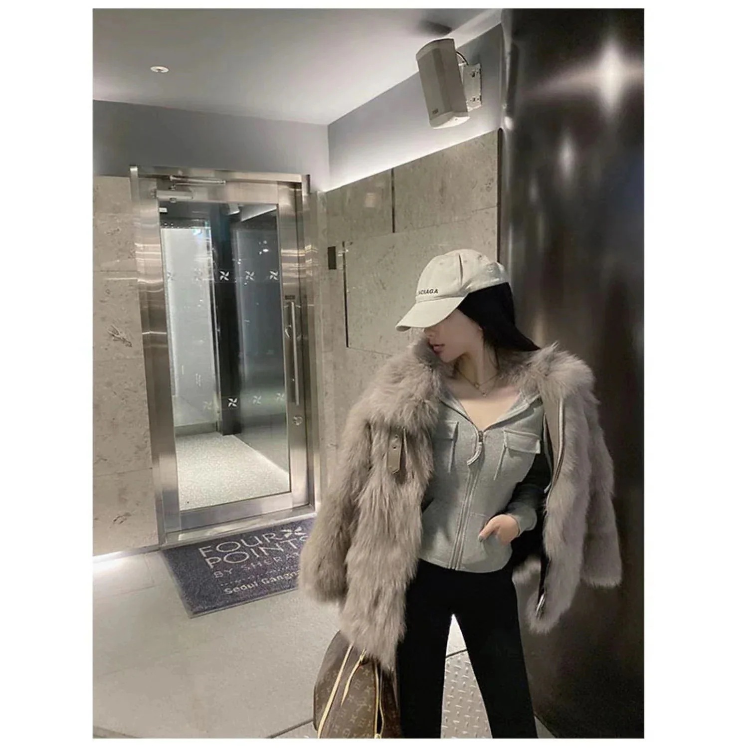 クファー付ショートジャケットコート フェックファー 暖かい人工ファー ジャケットキルティングアウター