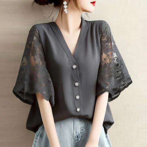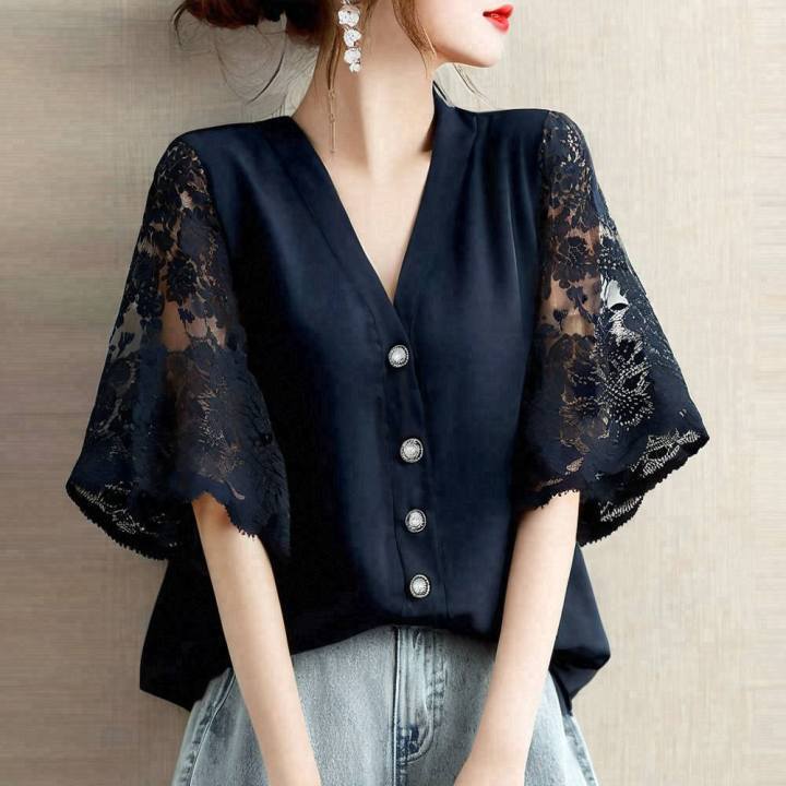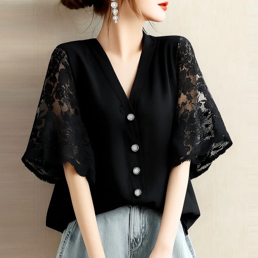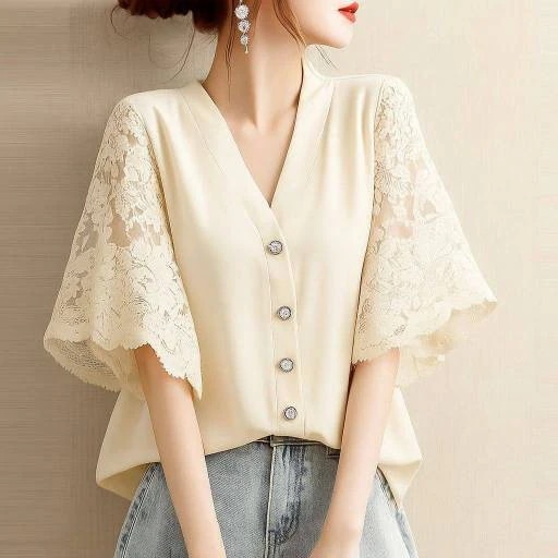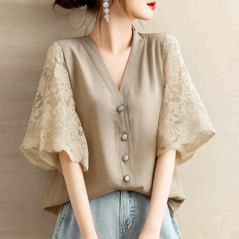 2026年夏の新作Vネック・前開きボタン留め 両袖レースのトップス シャツ・シフォンブラウス
