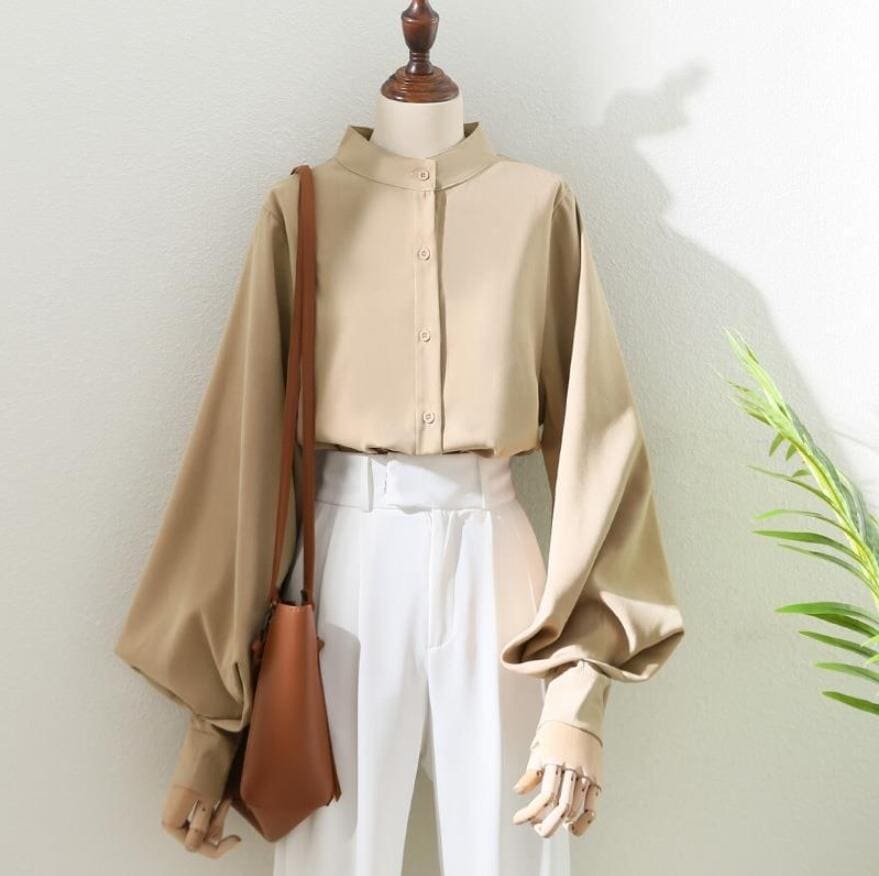 【迅速な出荷】パフスリーブシャツ女性長袖研ぎ毛トップス韓国版ゆったり港味スタンドカラーパフスリーブシャツ