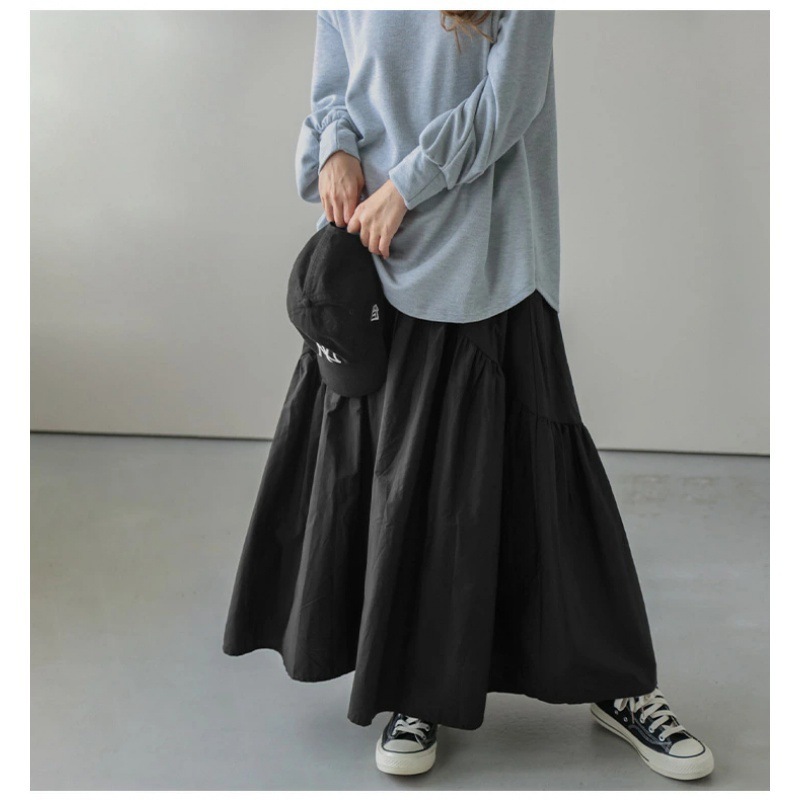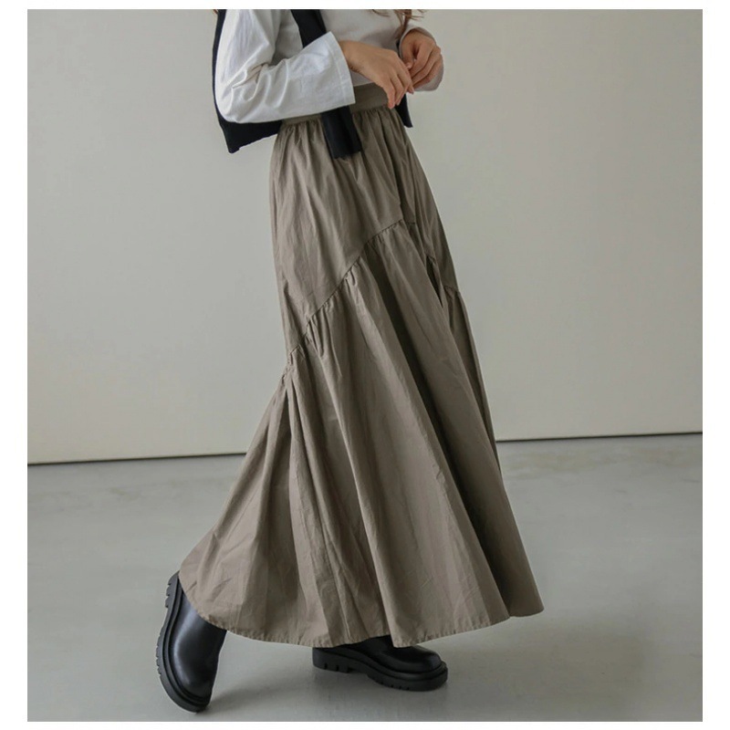 ロングスカート 新作カジュアルレトロウェーブプリーツハイウエストスカート 無地フィッシュテールスカート フレアロングスカート