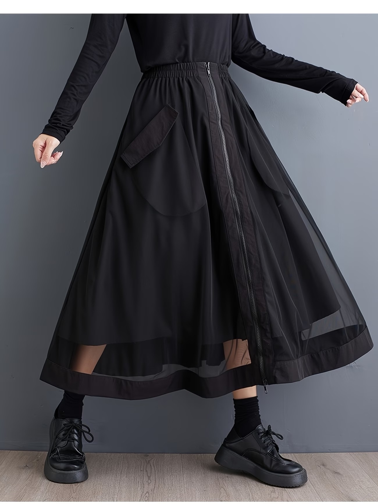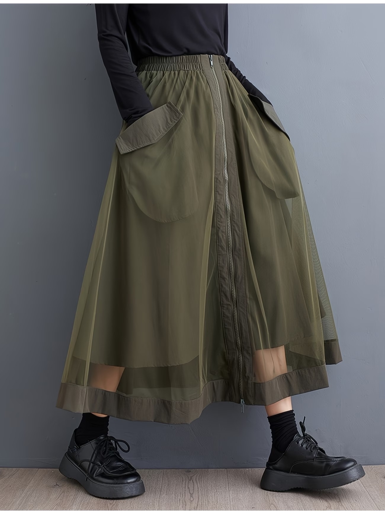 レディースロングスカート 春服 夏 向け チュールスカート ファスナー付き 無地 ウエストバンド ポケット付き カジュアルウェア オフィス 通勤スリム効果 体型カバー 4154