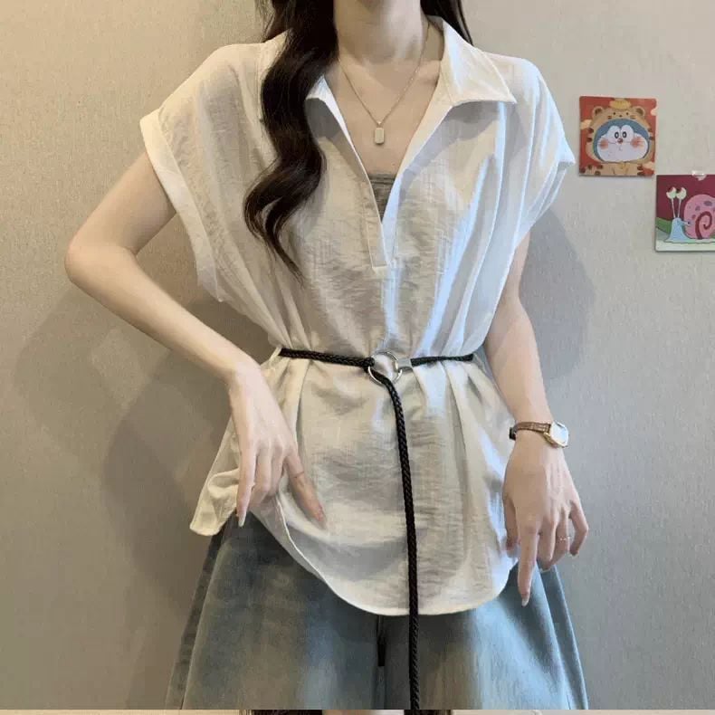【ベルト付き】レディース 夏用 プラスサイズ 2ピース風デザイン Vネック ストレートショルダーシャツ 新作 ぽっちゃり体型向け ウエストマークでスリムに見える 紐付きレディースシャツ・シフォンブラウ