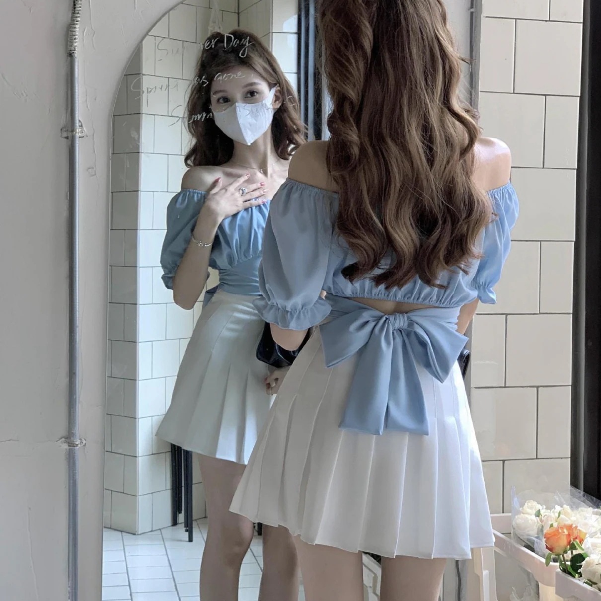 リボンストラップパフスリーブウエストマークボートネック半袖シャツレディースブリティッシュスタイルショート丈ティータイム風フレンチブラウス
